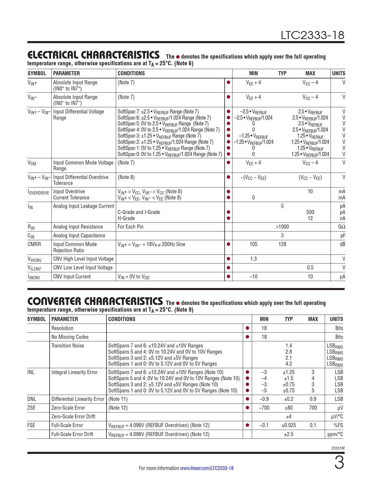 LTC2333-18 ELECTRICALCHARACTERISTICS The l denotes the specifications which apply over the full operatingtemperature range, otherwise specifications are at TA = 25°C. (Note 6)SYMBOLPARAMETERCONDITIONSMINTYPMAXUNITS VIN+ Absolute Input Range (Note 7) l VEE + 4 VCC – 4 V (IN0+ to IN7+) VIN– Absolute Input Range (Note 7) l VEE + 4 VCC – 4 V (IN0– to IN7–) VIN+ – VIN– Input Differential Voltage SoftSpan 7: ±2.5 • VREFBUF Range (Note 7) l –2.5 • VREFBUF 2.5 • VREFBUF V Range SoftSpan 6: ±2.5 • VREFBUF/1.024 Range (Note 7) l –2.5 • VREFBUF/1.024 2.5 • VREFBUF/1.024 V SoftSpan 5: 0V to 2.5 • VREFBUF Range (Note 7) l 0 2.5 • VREFBUF V SoftSpan 4: 0V to 2.5 • VREFBUF/1.024 Range (Note 7) l 0 2.5 • VREFBUF/1.024 V SoftSpan 3: ±1.25 • VREFBUF Range (Note 7) l –1.25 • VREFBUF 1.25 • VREFBUF V SoftSpan 2: ±1.25 • VREFBUF/1.024 Range (Note 7) l –1.25 • VREFBUF/1.024 1.25 • VREFBUF/1.024 V SoftSpan 1: 0V to 1.25 • VREFBUF Range (Note 7) l 0 1.25 • VREFBUF V SoftSpan 0: 0V to 1.25 • VREFBUF/1.024 Range (Note 7) l 0 1.25 • VREFBUF/1.024 V VCM Input Common Mode Voltage (Note 7) l VEE + 4 VCC – 4 V Range VIN+ – VIN– Input Differential Overdrive (Note 8) l −(VCC − VEE) (VCC − VEE) V Tolerance IOVERDRIVE Input Overdrive VIN+ > VCC, VIN− > VCC (Note 8) l 10 mA Current Tolerance VIN+ < VEE, VIN− < VEE (Note 8) l 0 mA IIN Analog Input Leakage Current 5 pA C-Grade and I-Grade l 500 pA H-Grade l 12 nA RIN Analog Input Resistance For Each Pin >1000 GΩ CIN Analog Input Capacitance 3 pF CMRR Input Common Mode VIN+ = VIN− = 18VP-P 200Hz Sine l 105 128 dB Rejection Ratio VIHCNV CNV High Level Input Voltage l 1.3 V VILCNV CNV Low Level Input Voltage l 0.5 V IINCNV CNV Input Current VIN = 0V to VDD l –10 10 μA CONVERTERCHARACTERISTICS The l denotes the specifications which apply over the full operatingtemperature range, otherwise specifications are at TA = 25°C. (Note 9) SYMBOL PARAMETERCONDITIONSMINTYPMAXUNITS Resolution l 18 Bits No Missing Codes l 18 Bits Transition Noise SoftSpans 7 and 6: ±10.24V and ±10V Ranges 1.4 LSBRMS SoftSpans 5 and 4: 0V to 10.24V and 0V to 10V Ranges 2.8 LSBRMS SoftSpans 3 and 2: ±5.12V and ±5V Ranges 2.1 LSBRMS SoftSpans 1 and 0: 0V to 5.12V and 0V to 5V Ranges 4.2 LSBRMS INL Integral Linearity Error SoftSpans 7 and 6: ±10.24V and ±10V Ranges (Note 10) l –3 ±1.25 3 LSB SoftSpans 5 and 4: 0V to 10.24V and 0V to 10V Ranges (Note 10) l –4 ±1.5 4 LSB SoftSpans 3 and 2: ±5.12V and ±5V Ranges (Note 10) l –3 ±0.75 3 LSB SoftSpans 1 and 0: 0V to 5.12V and 0V to 5V Ranges (Note 10) l –5 ±0.75 5 LSB DNL Differential Linearity Error (Note 11) l −0.9 ±0.2 0.9 LSB ZSE Zero-Scale Error (Note 12) l −700 ±80 700 μV Zero-Scale Error Drift ±4 μV/°C FSE Full-Scale Error VREFBUF = 4.096V (REFBUF Overdriven) (Note 12) l −0.1 ±0.025 0.1 %FS Full-Scale Error Drift VREFBUF = 4.096V (REFBUF Overdriven) (Note 12) ±2.5 ppm/°C 233318f For more information www.linear.com/LTC2333-18 3