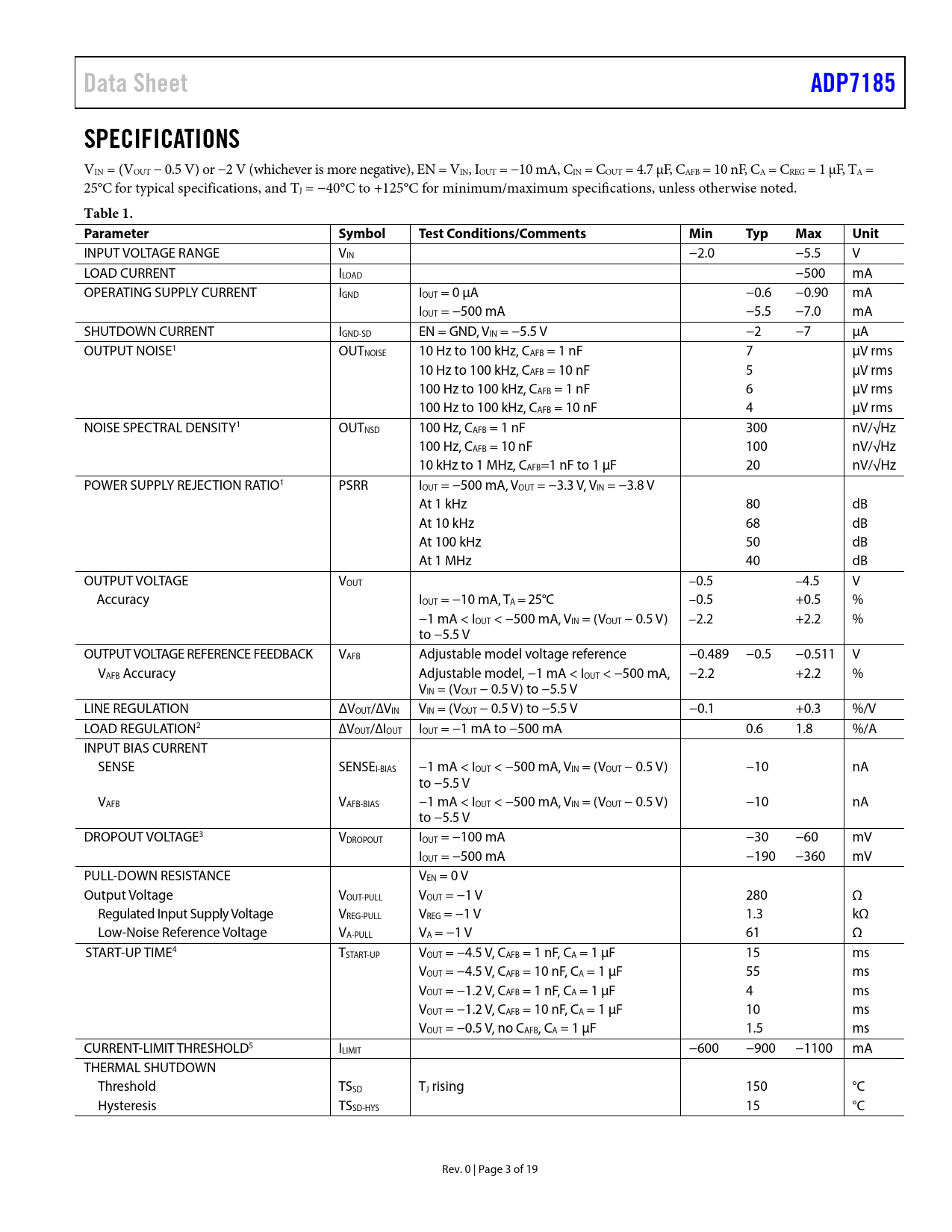 link to page 4 link to page 4 link to page 4 link to page 4 link to page 4 link to page 4 link to page 4 Data SheetADP7185SPECIFICATIONS VIN = (VOUT − 0.5 V) or −2 V (whichever is more negative), EN = VIN, IOUT = −10 mA, CIN = COUT = 4.7 μF, CAFB = 10 nF, CA = CREG = 1 μF, TA = 25°C for typical specifications, and TJ = −40°C to +125°C for minimum/maximum specifications, unless otherwise noted. Table 1. ParameterSymbolTest Conditions/CommentsMinTypMaxUnit INPUT VOLTAGE RANGE VIN −2.0 −5.5 V LOAD CURRENT ILOAD −500 mA OPERATING SUPPLY CURRENT IGND IOUT = 0 μA −0.6 −0.90 mA IOUT = −500 mA −5.5 −7.0 mA SHUTDOWN CURRENT IGND-SD EN = GND, VIN = −5.5 V −2 −7 μA OUTPUT NOISE1 OUTNOISE 10 Hz to 100 kHz, CAFB = 1 nF 7 μV rms 10 Hz to 100 kHz, CAFB = 10 nF 5 μV rms 100 Hz to 100 kHz, CAFB = 1 nF 6 μV rms 100 Hz to 100 kHz, CAFB = 10 nF 4 μV rms NOISE SPECTRAL DENSITY1 OUTNSD 100 Hz, CAFB = 1 nF 300 nV/√Hz 100 Hz, CAFB = 10 nF 100 nV/√Hz 10 kHz to 1 MHz, CAFB=1 nF to 1 μF 20 nV/√Hz POWER SUPPLY REJECTION RATIO1 PSRR IOUT = −500 mA, VOUT = −3.3 V, VIN = −3.8 V At 1 kHz 80 dB At 10 kHz 68 dB At 100 kHz 50 dB At 1 MHz 40 dB OUTPUT VOLTAGE VOUT –0.5 –4.5 V Accuracy IOUT = −10 mA, TA = 25°C –0.5 +0.5 % −1 mA < IOUT < −500 mA, VIN = (VOUT − 0.5 V) –2.2 +2.2 % to −5.5 V OUTPUT VOLTAGE REFERENCE FEEDBACK VAFB Adjustable model voltage reference −0.489 −0.5 −0.511 V VAFB Accuracy Adjustable model, −1 mA < IOUT < −500 mA, −2.2 +2.2 % VIN = (VOUT − 0.5 V) to −5.5 V LINE REGULATION ΔVOUT/∆VIN VIN = (VOUT − 0.5 V) to −5.5 V −0.1 +0.3 %/V LOAD REGULATION2 ∆VOUT/∆IOUT IOUT = −1 mA to −500 mA 0.6 1.8 %/A INPUT BIAS CURRENT SENSE SENSEI-BIAS −1 mA < IOUT < −500 mA, VIN = (VOUT − 0.5 V) −10 nA to −5.5 V VAFB VAFB-BIAS −1 mA < IOUT < −500 mA, VIN = (VOUT − 0.5 V) −10 nA to −5.5 V DROPOUT VOLTAGE3 VDROPOUT IOUT = −100 mA −30 −60 mV IOUT = −500 mA −190 −360 mV PULL-DOWN RESISTANCE VEN = 0 V Output Voltage VOUT-PULL VOUT = −1 V 280 Ω Regulated Input Supply Voltage VREG-PULL VREG = −1 V 1.3 kΩ Low-Noise Reference Voltage VA-PULL VA = −1 V 61 Ω START-UP TIME4 TSTART-UP VOUT = −4.5 V, CAFB = 1 nF, CA = 1 μF 15 ms VOUT = −4.5 V, CAFB = 10 nF, CA = 1 μF 55 ms VOUT = −1.2 V, CAFB = 1 nF, CA = 1 μF 4 ms VOUT = −1.2 V, CAFB = 10 nF, CA = 1 μF 10 ms VOUT = −0.5 V, no CAFB, CA = 1 μF 1.5 ms CURRENT-LIMIT THRESHOLD5 ILIMIT −600 −900 −1100 mA THERMAL SHUTDOWN Threshold TSSD TJ rising 150 °C Hysteresis TSSD-HYS 15 °C Rev. 0 | Page 3 of 19 Document Outline FEATURES APPLICATIONS TYPICAL APPLICATION CIRCUITS GENERAL DESCRIPTION TABLE OF CONTENTS REVISION HISTORY SPECIFICATIONS INPUT AND OUTPUT CAPACITOR RECOMMENDED SPECIFICATIONS ABSOLUTE MAXIMUM RATINGS THERMAL DATA THERMAL RESISTANCE ESD CAUTION PIN CONFIGURATION AND FUNCTION DESCRIPTIONS TYPICAL PERFORMANCE CHARACTERISTICS THEORY OF OPERATION ADJUSTABLE MODE OPERATION ENABLE PIN OPERATION START-UP TIME APPLICATIONS INFORMATION ADIsimPOWER DESIGN TOOL CAPACITOR SELECTION Output Capacitor Input Bypass Capacitor CA and CAFB Capacitors Input and Output Capacitor Properties UNDERVOLTAGE LOCKOUT (UVLO) CURRENT-LIMIT AND THERMAL OVERLOAD PROTECTION THERMAL CONSIDERATIONS OUTLINE DIMENSIONS ORDERING GUIDE