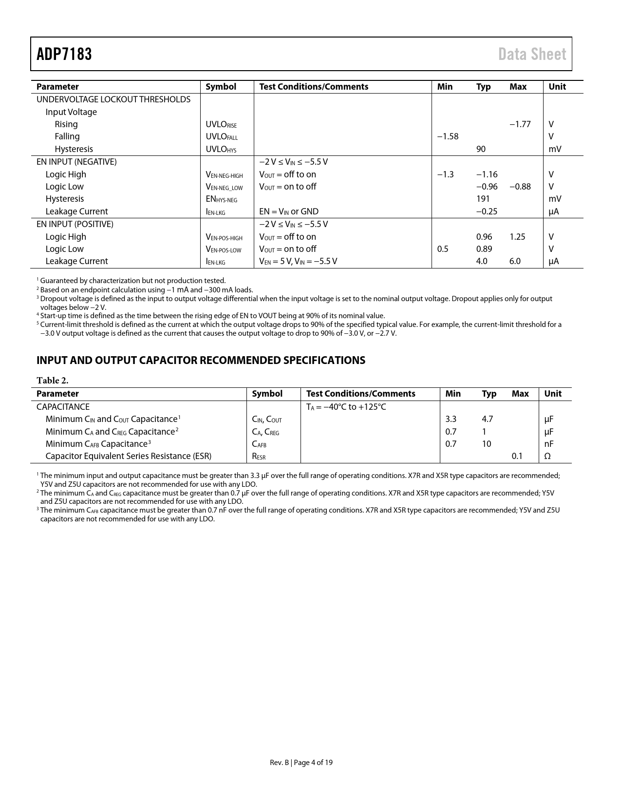 ADP7183Data SheetParameterSymbolTest Conditions/CommentsMinTypMaxUnit UNDERVOLTAGE LOCKOUT THRESHOLDS Input Voltage Rising UVLORISE −1.77 V Falling UVLOFALL −1.58 V Hysteresis UVLOHYS 90 mV EN INPUT (NEGATIVE) −2 V ≤ VIN ≤ −5.5 V Logic High VEN-NEG-HIGH VOUT = off to on −1.3 −1.16 V Logic Low VEN-NEG_LOW VOUT = on to off −0.96 −0.88 V Hysteresis ENHYS-NEG 191 mV Leakage Current IEN-LKG EN = VIN or GND −0.25 µA EN INPUT (POSITIVE) −2 V ≤ VIN ≤ −5.5 V Logic High VEN-POS-HIGH VOUT = off to on 0.96 1.25 V Logic Low VEN-POS-LOW VOUT = on to off 0.5 0.89 V Leakage Current IEN-LKG VEN = 5 V, VIN = −5.5 V 4.0 6.0 µA 1 Guaranteed by characterization but not production tested. 2 Based on an endpoint calculation using −1 mA and −300 mA loads. 3 Dropout voltage is defined as the input to output voltage differential when the input voltage is set to the nominal output voltage. Dropout applies only for output voltages below −2 V. 4 Start-up time is defined as the time between the rising edge of EN to VOUT being at 90% of its nominal value. 5 Current-limit threshold is defined as the current at which the output voltage drops to 90% of the specified typical value. For example, the current-limit threshold for a −3.0 V output voltage is defined as the current that causes the output voltage to drop to 90% of −3.0 V, or −2.7 V. INPUT AND OUTPUT CAPACITOR RECOMMENDED SPECIFICATIONSTable 2. ParameterSymbolTest Conditions/CommentsMinTypMaxUnit CAPACITANCE TA = −40°C to +125°C Minimum CIN and COUT Capacitance1 CIN, COUT 3.3 4.7 µF Minimum CA and CREG Capacitance2 CA, CREG 0.7 1 µF Minimum CAFB Capacitance3 CAFB 0.7 10 nF Capacitor Equivalent Series Resistance (ESR) RESR 0.1 Ω 1 The minimum input and output capacitance must be greater than 3.3 µF over the full range of operating conditions. X7R and X5R type capacitors are recommended; Y5V and Z5U capacitors are not recommended for use with any LDO. 2 The minimum CA and CREG capacitance must be greater than 0.7 µF over the full range of operating conditions. X7R and X5R type capacitors are recommended; Y5V and Z5U capacitors are not recommended for use with any LDO. 3 The minimum CAFB capacitance must be greater than 0.7 nF over the full range of operating conditions. X7R and X5R type capacitors are recommended; Y5V and Z5U capacitors are not recommended for use with any LDO. Rev. B | Page 4 of 19 Document Outline FEATURES APPLICATIONS TYPICAL APPLICATION CIRCUITS GENERAL DESCRIPTION TABLE OF CONTENTS REVISION HISTORY SPECIFICATIONS INPUT AND OUTPUT CAPACITOR RECOMMENDED SPECIFICATIONS ABSOLUTE MAXIMUM RATINGS THERMAL DATA THERMAL RESISTANCE ESD CAUTION PIN CONFIGURATION AND FUNCTION DESCRIPTIONS TYPICAL PERFORMANCE CHARACTERISTICS THEORY OF OPERATION ADJUSTABLE MODE OPERATION ENABLE PIN OPERATION START-UP TIME APPLICATIONS INFORMATION ADIsimPOWER DESIGN TOOL CAPACITOR SELECTION Output Capacitor Input Bypass Capacitor CA and CAFB Capacitors Input and Output Capacitor Properties UNDERVOLTAGE LOCKOUT (UVLO) CURRENT-LIMIT AND THERMAL OVERLOAD PROTECTION THERMAL CONSIDERATIONS PCB LAYOUT CONSIDERATIONS OUTLINE DIMENSIONS ORDERING GUIDE