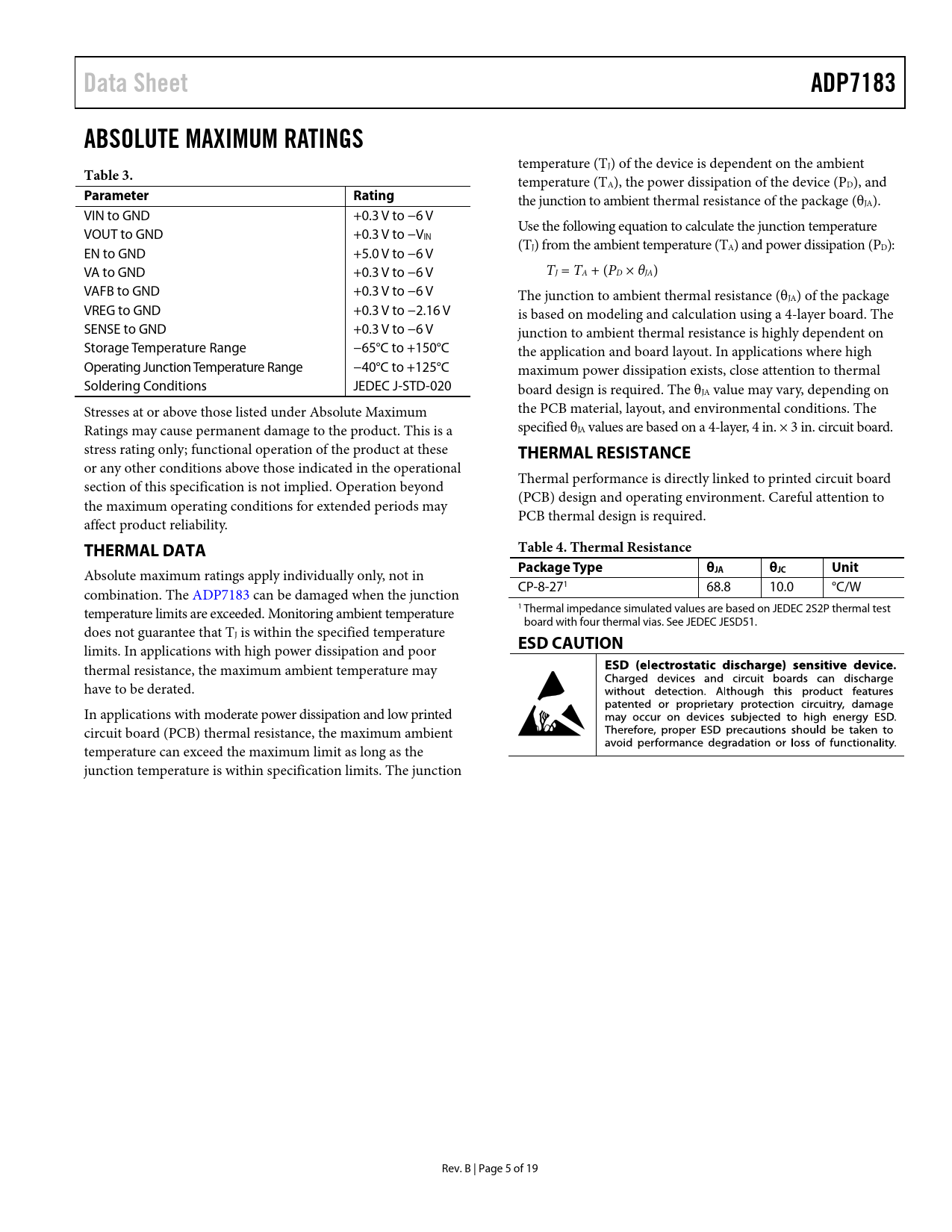Data Sheet ADP7183 ABSOLUTE MAXIMUM RATINGS Table 3 Parameter Rating THERMAL RESISTANCE THERMAL DATA