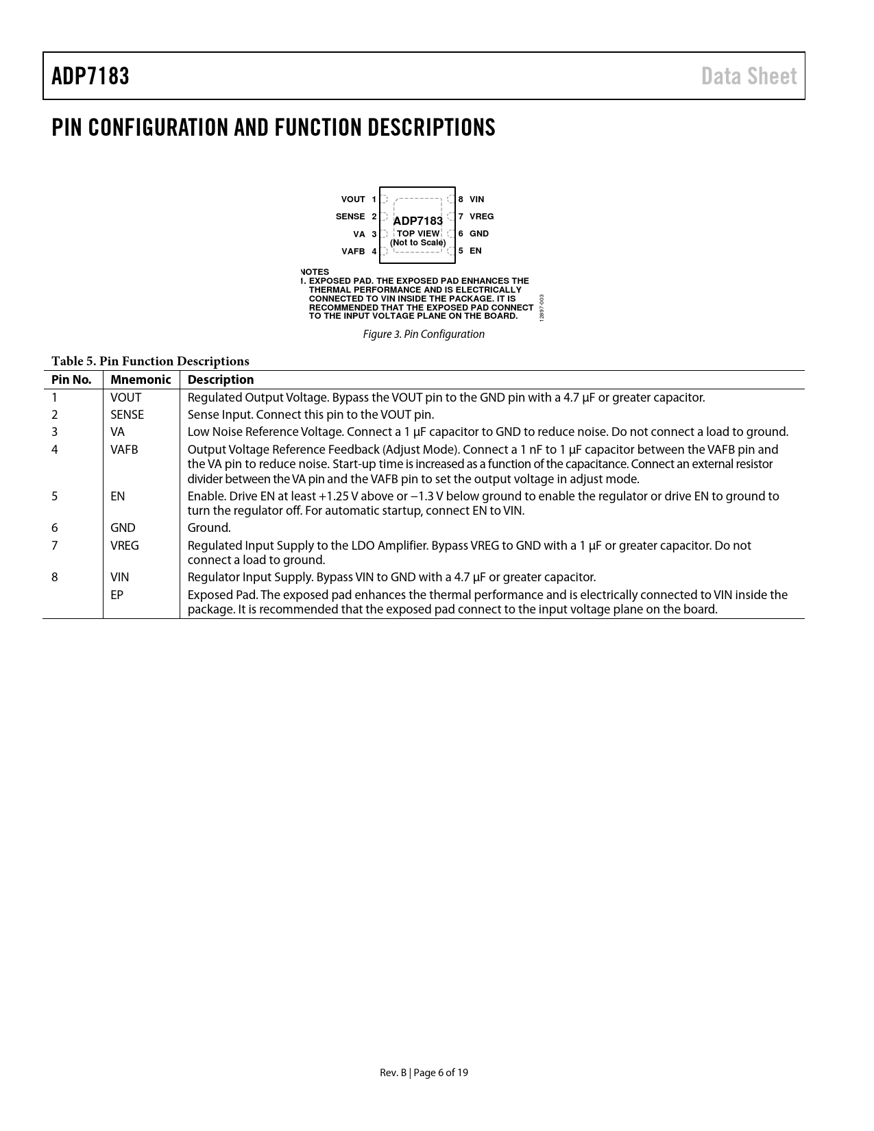 ADP7183Data SheetPIN CONFIGURATION AND FUNCTION DESCRIPTIONSVOUT 18 VINSENSE 27 VREGADP7183VA 3TOP VIEW6 GND(Not to Scale)VAFB 45 ENNOTES 1. EXPOSED PAD. THE EXPOSED PAD ENHANCES THETHERMAL PERFORMANCE AND IS ELECTRICALLY CONNECTED TO VIN INSIDE THE PACKAGE. IT IS 003 RECOMMENDED THAT THE EXPOSED PAD CONNECT TO THE INPUT VOLTAGE PLANE ON THE BOARD. 12897- Figure 3. Pin Configuration Table 5. Pin Function Descriptions Pin No.Mnemonic Description 1 VOUT Regulated Output Voltage. Bypass the VOUT pin to the GND pin with a 4.7 µF or greater capacitor. 2 SENSE Sense Input. Connect this pin to the VOUT pin. 3 VA Low Noise Reference Voltage. Connect a 1 µF capacitor to GND to reduce noise. Do not connect a load to ground. 4 VAFB Output Voltage Reference Feedback (Adjust Mode). Connect a 1 nF to 1 µF capacitor between the VAFB pin and the VA pin to reduce noise. Start-up time is increased as a function of the capacitance. Connect an external resistor divider between the VA pin and the VAFB pin to set the output voltage in adjust mode. 5 EN Enable. Drive EN at least +1.25 V above or −1.3 V below ground to enable the regulator or drive EN to ground to turn the regulator off. For automatic startup, connect EN to VIN. 6 GND Ground. 7 VREG Regulated Input Supply to the LDO Amplifier. Bypass VREG to GND with a 1 µF or greater capacitor. Do not connect a load to ground. 8 VIN Regulator Input Supply. Bypass VIN to GND with a 4.7 µF or greater capacitor. EP Exposed Pad. The exposed pad enhances the thermal performance and is electrically connected to VIN inside the package. It is recommended that the exposed pad connect to the input voltage plane on the board. Rev. B | Page 6 of 19 Document Outline FEATURES APPLICATIONS TYPICAL APPLICATION CIRCUITS GENERAL DESCRIPTION TABLE OF CONTENTS REVISION HISTORY SPECIFICATIONS INPUT AND OUTPUT CAPACITOR RECOMMENDED SPECIFICATIONS ABSOLUTE MAXIMUM RATINGS THERMAL DATA THERMAL RESISTANCE ESD CAUTION PIN CONFIGURATION AND FUNCTION DESCRIPTIONS TYPICAL PERFORMANCE CHARACTERISTICS THEORY OF OPERATION ADJUSTABLE MODE OPERATION ENABLE PIN OPERATION START-UP TIME APPLICATIONS INFORMATION ADIsimPOWER DESIGN TOOL CAPACITOR SELECTION Output Capacitor Input Bypass Capacitor CA and CAFB Capacitors Input and Output Capacitor Properties UNDERVOLTAGE LOCKOUT (UVLO) CURRENT-LIMIT AND THERMAL OVERLOAD PROTECTION THERMAL CONSIDERATIONS PCB LAYOUT CONSIDERATIONS OUTLINE DIMENSIONS ORDERING GUIDE