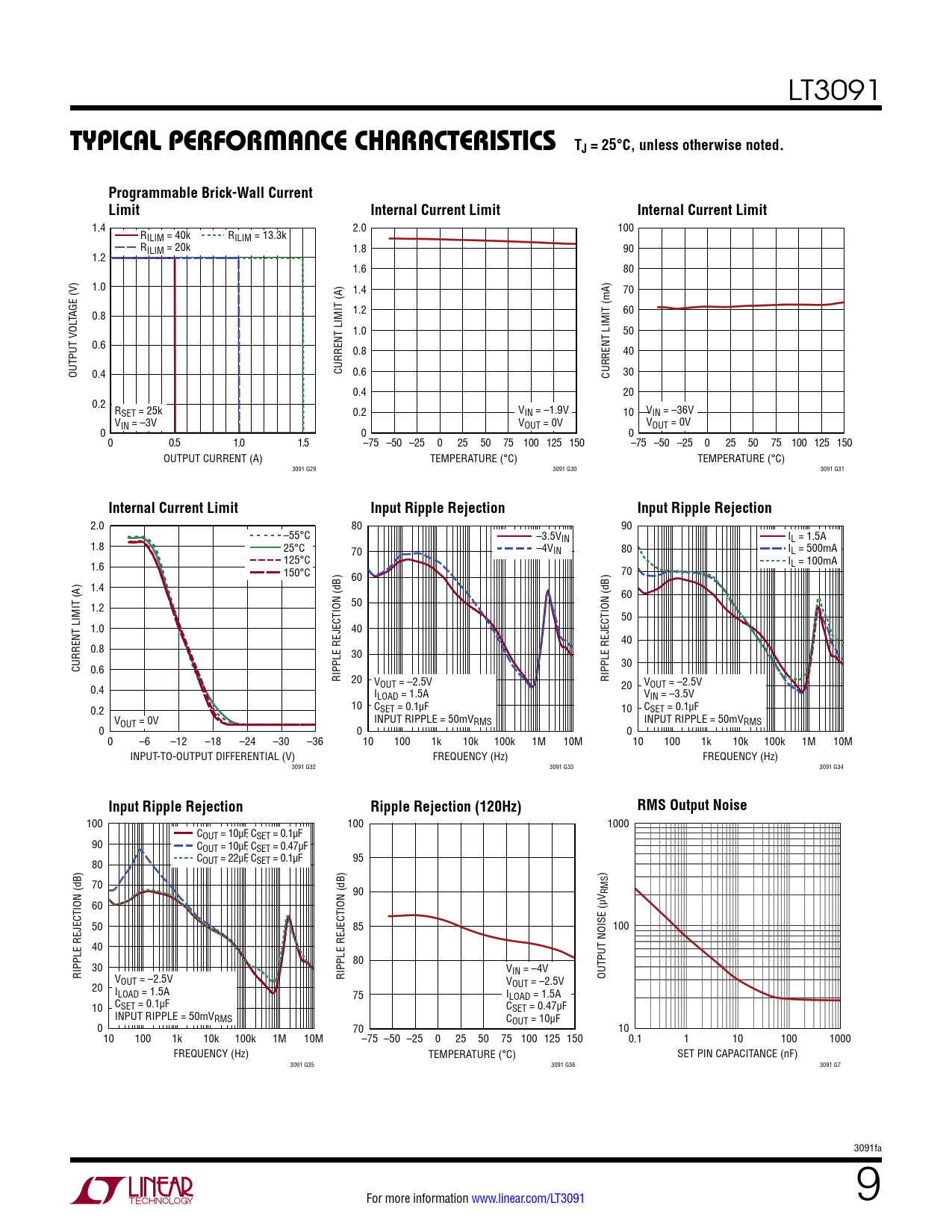 1.4 2.0 100 RILIM = 40k RILIM = 13.3k RILIM = 20k 1.8 90 1.2 1.6 80 1.0 1.4 70 1.2 60 TAGE (V) 0.8 1.0 50 0.6 0.8 40 OUTPUT VOL 0.4 CURRENT LIMIT (A) 0.6 CURRENT LIMIT (mA) 30 0.4 20 0.2 RSET = 25k 0.2 VIN = –1.9V 10 VIN = –36V V VOUT = 0V V IN = –3V OUT = 0V 0 0 0 0 0.5 1.0 1.5 –75 –50 –25 0 25 50 75 100 125 150 –75 –50 –25 0 25 50 75 100 125 150 OUTPUT CURRENT (A) TEMPERATURE (°C) TEMPERATURE (°C) 3091 G29 3091 G30 3091 G31