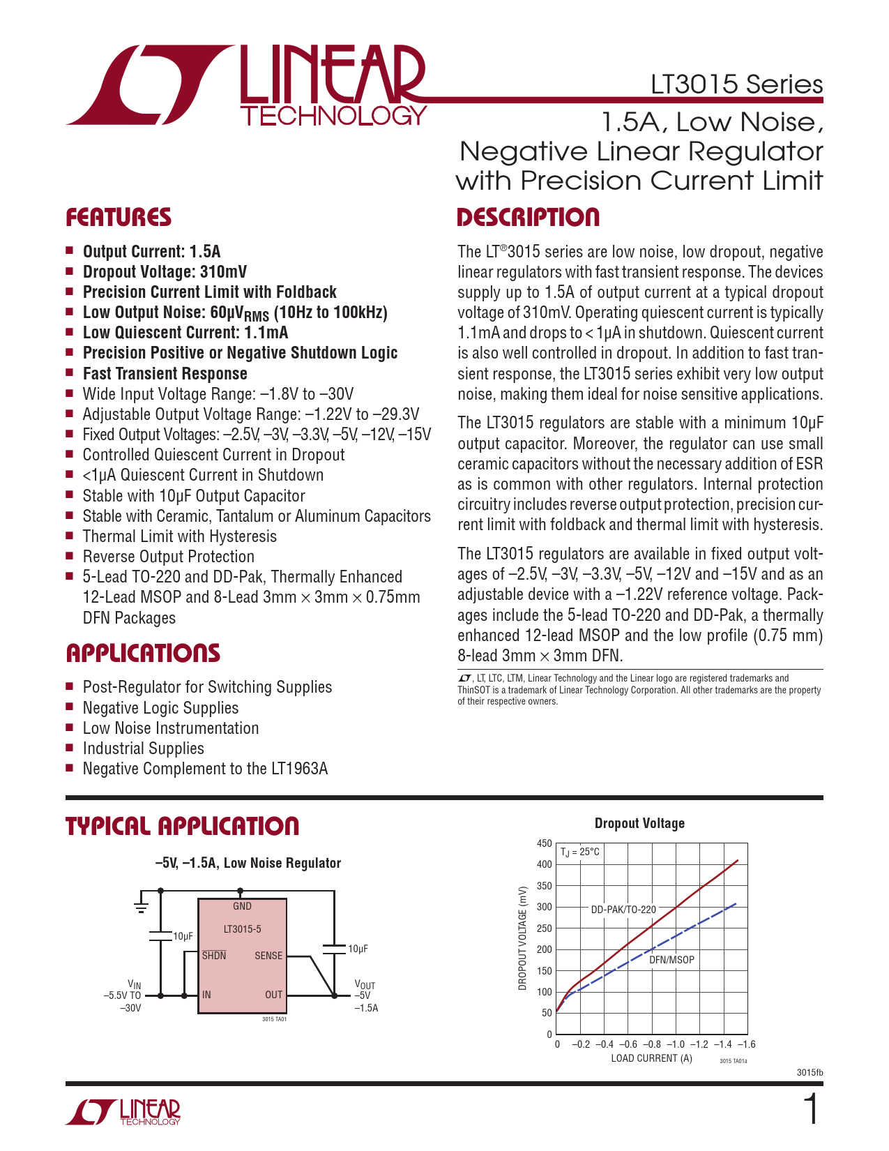 LT3015 Series 1.5A, Low Noise, Negative Linear Regulator with Precision Current Limit FEATURESDESCRIPTION n Output Current: 1.5A The LT®3015 series are low noise, low dropout, negative n Dropout Voltage: 310mV linear regulators with fast transient response. The devices n Precision Current Limit with Foldback supply up to 1.5A of output current at a typical dropout n Low Output Noise: 60µVRMS (10Hz to 100kHz) voltage of 310mV. Operating quiescent current is typically n Low Quiescent Current: 1.1mA 1.1mA and drops to < 1µA in shutdown. Quiescent current n Precision Positive or Negative Shutdown Logic is also well controlled in dropout. In addition to fast tran- n Fast Transient Response sient response, the LT3015 series exhibit very low output n Wide Input Voltage Range: –1.8V to –30V noise, making them ideal for noise sensitive applications. n Adjustable Output Voltage Range: –1.22V to –29.3V The LT3015 regulators are stable with a minimum 10µF n Fixed Output Voltages: –2.5V, –3V, –3.3V, –5V, –12V, –15V output capacitor. Moreover, the regulator can use small n Controlled Quiescent Current in Dropout ceramic capacitors without the necessary addition of ESR n <1µA Quiescent Current in Shutdown as is common with other regulators. Internal protection n Stable with 10µF Output Capacitor circuitry includes reverse output protection, precision cur- n Stable with Ceramic, Tantalum or Aluminum Capacitors rent limit with foldback and thermal limit with hysteresis. n Thermal Limit with Hysteresis n Reverse Output Protection The LT3015 regulators are available in fixed output volt- n 5-Lead TO-220 and DD-Pak, Thermally Enhanced ages of –2.5V, –3V, –3.3V, –5V, –12V and –15V and as an 12-Lead MSOP and 8-Lead 3mm × 3mm × 0.75mm adjustable device with a –1.22V reference voltage. Pack- DFN Packages ages include the 5-lead TO-220 and DD-Pak, a thermally enhanced 12-lead MSOP and the low profile (0.75 mm) APPLICATIONS 8-lead 3mm × 3mm DFN. L, LT, LTC, LTM, Linear Technology and the Linear logo are registered trademarks and n Post-Regulator for Switching Supplies ThinSOT is a trademark of Linear Technology Corporation. All other trademarks are the property of their respective owners. n Negative Logic Supplies n Low Noise Instrumentation n Industrial Supplies n Negative Complement to the LT1963A TYPICAL APPLICATIONDropout Voltage 450 T –5V, –1.5A, Low Noise Regulator J = 25°C 400 350 GND 300 DD-PAK/TO-220 LT3015-5 TAGE (mV) 250 10µF 10µF 200 SHDN SENSE DFN/MSOP 150 VIN VOUT DROPOUT VOL –5.5V TO IN OUT –5V 100 –30V –1.5A 50 3015 TA01 0 0 –0.2 –0.4 –0.6 –0.8 –1.0 –1.2 –1.4 –1.6 LOAD CURRENT (A) 3015 TA01a 3015fb 1 Document Outline Features Applications Description Typical Application Absolute Maximum Ratings Pin Configuration Order Information Electrical Characteristics Typical Performance Characteristics Pin Functions Block Diagram Applications Information Typical Applications Package Description Revision History Typical Application Related Parts