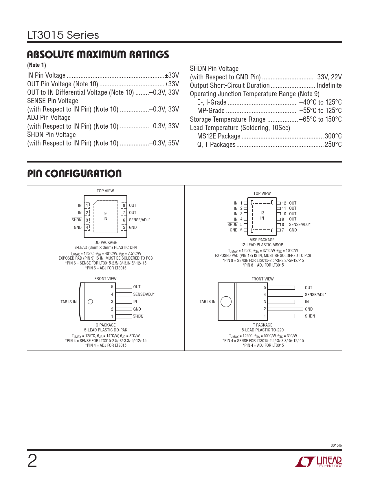LT3015 Series ABSOLUTE MAXIMUM RATINGS(Note 1) SHDN Pin Voltage IN Pin Voltage ...±33V (with Respect to GND Pin) ..–33V, 22V OUT Pin Voltage (Note 10) ..±33V Output Short-Circuit Duration .. Indefinite OUT to IN Differential Voltage (Note 10) ..–0.3V, 33V Operating Junction Temperature Range (Note 9) SENSE Pin Voltage E-, I-Grade .. –40°C to 125°C (with Respect to IN Pin) (Note 10) ...–0.3V, 33V MP-Grade ... –55°C to 125°C ADJ Pin Voltage Storage Temperature Range .. –65°C to 150°C (with Respect to IN Pin) (Note 10) ...–0.3V, 33V Lead Temperature (Soldering, 10Sec) SHDN Pin Voltage MS12E Package ..300°C (with Respect to IN Pin) (Note 10) ...–0.3V, 55V Q, T Packages ... 250°C PIN CONFIGURATION TOP VIEW TOP VIEW IN 1 8 OUT IN 1 12 OUT IN 2 11 OUT IN 2 9 7 OUT IN 3 13 10 OUT IN SHDN 3 6 SENSE/ADJ* IN 4 IN 9 OUT SHDN 5 8 SENSE/ADJ* GND 4 5 GND GND 6 7 GND DD PACKAGE MSE PACKAGE 8-LEAD (3mm × 3mm) PLASTIC DFN 12-LEAD PLASTIC MSOP T T JMAX = 125°C, qJA = 37°C/W, qJC = 10°C/W JMAX = 125°C, qJA = 40°C/W, qJC = 7.5°C/W EXPOSED PAD (PIN 13) IS IN, MUST BE SOLDERED TO PCB EXPOSED PAD (PIN 9) IS IN, MUST BE SOLDERED TO PCB *PIN 8 = SENSE FOR LT3015-2.5/-3/-3.3/-5/-12/-15 *PIN 6 = SENSE FOR LT3015-2.5/-3/-3.3/-5/-12/-15 *PIN 8 = ADJ FOR LT3015 *PIN 6 = ADJ FOR LT3015 FRONT VIEW FRONT VIEW 5 OUT 5 OUT 4 SENSE/ADJ* 4 SENSE/ADJ* TAB IS IN 3 IN TAB IS IN 3 IN 2 GND 2 GND 1 SHDN 1 SHDN Q PACKAGE T PACKAGE 5-LEAD PLASTIC DD-PAK 5-LEAD PLASTIC TO-220 TJMAX = 125°C, qJA = 14°C/W, qJC = 3°C/W TJMAX = 125°C, qJA = 50°C/W, qJC = 3°C/W *PIN 4 = SENSE FOR LT3015-2.5/-3/-3.3/-5/-12/-15 *PIN 4 = SENSE FOR LT3015-2.5/-3/-3.3/-5/-12/-15 *PIN 4 = ADJ FOR LT3015 *PIN 4 = ADJ FOR LT3015 3015fb 2 Document Outline Features Applications Description Typical Application Absolute Maximum Ratings Pin Configuration Order Information Electrical Characteristics Typical Performance Characteristics Pin Functions Block Diagram Applications Information Typical Applications Package Description Revision History Typical Application Related Parts