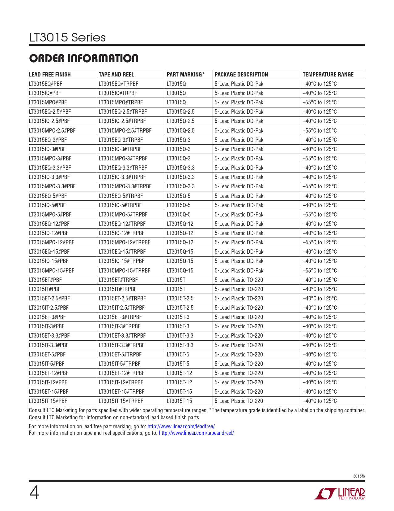 LT3015EQ#PBF LT3015EQ#TRPBF LT3015Q 5-Lead Plastic DD-Pak –40°C to 125°C LT3015IQ#PBF LT3015IQ#TRPBF LT3015Q 5-Lead Plastic DD-Pak –40°C to 125°C LT3015MPQ#PBF LT3015MPQ#TRPBF LT3015Q 5-Lead Plastic DD-Pak –55°C to 125°C LT3015EQ-2.5#PBF LT3015EQ-2.5#TRPBF LT3015Q-2.5 5-Lead Plastic DD-Pak –40°C to 125°C LT3015IQ-2.5#PBF LT3015IQ-2.5#TRPBF LT3015Q-2.5 5-Lead Plastic DD-Pak –40°C to 125°C LT3015MPQ-2.5#PBF LT3015MPQ-2.5#TRPBF LT3015Q-2.5 5-Lead Plastic DD-Pak –55°C to 125°C LT3015EQ-3#PBF LT3015EQ-3#TRPBF LT3015Q-3 5-Lead Plastic DD-Pak –40°C to 125°C LT3015IQ-3#PBF LT3015IQ-3#TRPBF LT3015Q-3 5-Lead Plastic DD-Pak –40°C to 125°C LT3015MPQ-3#PBF LT3015MPQ-3#TRPBF LT3015Q-3 5-Lead Plastic DD-Pak –55°C to 125°C LT3015EQ-3.3#PBF LT3015EQ-3.3#TRPBF LT3015Q-3.3 5-Lead Plastic DD-Pak –40°C to 125°C LT3015IQ-3.3#PBF LT3015IQ-3.3#TRPBF LT3015Q-3.3 5-Lead Plastic DD-Pak –40°C to 125°C LT3015MPQ-3.3#PBF LT3015MPQ-3.3#TRPBF LT3015Q-3.3 5-Lead Plastic DD-Pak –55°C to 125°C LT3015EQ-5#PBF LT3015EQ-5#TRPBF LT3015Q-5 5-Lead Plastic DD-Pak –40°C to 125°C LT3015IQ-5#PBF LT3015IQ-5#TRPBF LT3015Q-5 5-Lead Plastic DD-Pak –40°C to 125°C LT3015MPQ-5#PBF LT3015MPQ-5#TRPBF LT3015Q-5 5-Lead Plastic DD-Pak –55°C to 125°C LT3015EQ-12#PBF LT3015EQ-12#TRPBF LT3015Q-12 5-Lead Plastic DD-Pak –40°C to 125°C LT3015IQ-12#PBF LT3015IQ-12#TRPBF LT3015Q-12 5-Lead Plastic DD-Pak –40°C to 125°C LT3015MPQ-12#PBF LT3015MPQ-12#TRPBF LT3015Q-12 5-Lead Plastic DD-Pak –55°C to 125°C LT3015EQ-15#PBF LT3015EQ-15#TRPBF LT3015Q-15 5-Lead Plastic DD-Pak –40°C to 125°C LT3015IQ-15#PBF LT3015IQ-15#TRPBF LT3015Q-15 5-Lead Plastic DD-Pak –40°C to 125°C LT3015MPQ-15#PBF LT3015MPQ-15#TRPBF LT3015Q-15 5-Lead Plastic DD-Pak –55°C to 125°C LT3015ET#PBF LT3015ET#TRPBF LT3015T 5-Lead Plastic TO-220 –40°C to 125°C LT3015IT#PBF LT3015IT#TRPBF LT3015T 5-Lead Plastic TO-220 –40°C to 125°C LT3015ET-2.5#PBF LT3015ET-2.5#TRPBF LT3015T-2.5 5-Lead Plastic TO-220 –40°C to 125°C LT3015IT-2.5#PBF LT3015IT-2.5#TRPBF LT3015T-2.5 5-Lead Plastic TO-220 –40°C to 125°C LT3015ET-3#PBF LT3015ET-3#TRPBF LT3015T-3 5-Lead Plastic TO-220 –40°C to 125°C LT3015IT-3#PBF LT3015IT-3#TRPBF LT3015T-3 5-Lead Plastic TO-220 –40°C to 125°C LT3015ET-3.3#PBF LT3015ET-3.3#TRPBF LT3015T-3.3 5-Lead Plastic TO-220 –40°C to 125°C LT3015IT-3.3#PBF LT3015IT-3.3#TRPBF LT3015T-3.3 5-Lead Plastic TO-220 –40°C to 125°C LT3015ET-5#PBF LT3015ET-5#TRPBF LT3015T-5 5-Lead Plastic TO-220 –40°C to 125°C LT3015IT-5#PBF LT3015IT-5#TRPBF LT3015T-5 5-Lead Plastic TO-220 –40°C to 125°C LT3015ET-12#PBF LT3015ET-12#TRPBF LT3015T-12 5-Lead Plastic TO-220 –40°C to 125°C LT3015IT-12#PBF LT3015IT-12#TRPBF LT3015T-12 5-Lead Plastic TO-220 –40°C to 125°C LT3015ET-15#PBF LT3015ET-15#TRPBF LT3015T-15 5-Lead Plastic TO-220 –40°C to 125°C LT3015IT-15#PBF LT3015IT-15#TRPBF LT3015T-15 5-Lead Plastic TO-220 –40°C to 125°C Consult LTC Marketing for parts specified with wider operating temperature ranges. *The temperature grade is identified by a label on the shipping container. Consult LTC Marketing for information on non-standard lead based finish parts. For more information on lead free part marking, go to: http://www.linear.com/leadfree/ For more information on tape and reel specifications, go to: http://www.linear.com/tapeandreel/ 3015fb 4 Document Outline Features Applications Description Typical Application Absolute Maximum Ratings Pin Configuration Order Information Electrical Characteristics Typical Performance Characteristics Pin Functions Block Diagram Applications Information Typical Applications Package Description Revision History Typical Application Related Parts