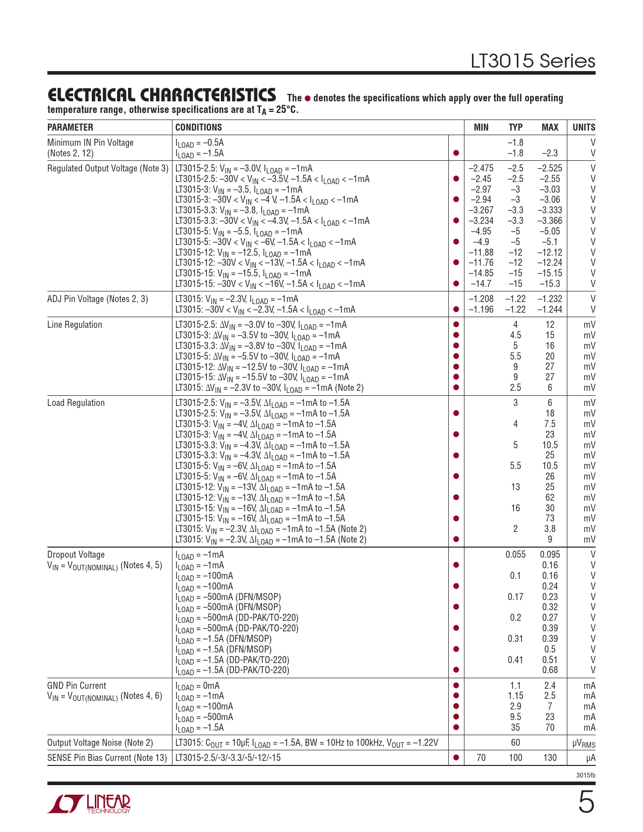 Minimum IN Pin Voltage ILOAD = –0.5A –1.8 V (Notes 2, 12) ILOAD = –1.5A l –1.8 –2.3 V Regulated Output Voltage (Note 3) LT3015-2.5: VIN = –3.0V, ILOAD = –1mA –2.475 –2.5 –2.525 V LT3015-2.5: –30V < VIN < –3.5V, –1.5A < ILOAD < –1mA l –2.45 –2.5 –2.55 V LT3015-3: VIN = –3.5, ILOAD = –1mA –2.97 –3 –3.03 V LT3015-3: –30V < VIN < –4 V, –1.5A < ILOAD < –1mA l –2.94 –3 –3.06 V LT3015-3.3: VIN = –3.8, ILOAD = –1mA –3.267 –3.3 –3.333 V LT3015-3.3: –30V < VIN < –4.3V, –1.5A < ILOAD < –1mA l –3.234 –3.3 –3.366 V LT3015-5: VIN = –5.5, ILOAD = –1mA –4.95 –5 –5.05 V LT3015-5: –30V < VIN < –6V, –1.5A < ILOAD < –1mA l –4.9 –5 –5.1 V LT3015-12: VIN = –12.5, ILOAD = –1mA –11.88 –12 –12.12 V LT3015-12: –30V < VIN < –13V, –1.5A < ILOAD < –1mA l –11.76 –12 –12.24 V LT3015-15: VIN = –15.5, ILOAD = –1mA –14.85 –15 –15.15 V LT3015-15: –30V < VIN < –16V, –1.5A < ILOAD < –1mA l –14.7 –15 –15.3 V ADJ Pin Voltage (Notes 2, 3) LT3015: VIN = –2.3V, ILOAD = –1mA –1.208 –1.22 –1.232 V LT3015: –30V < VIN < –2.3V, –1.5A < ILOAD < –1mA l –1.196 –1.22 –1.244 V Line Regulation LT3015-2.5: ∆VIN = –3.0V to –30V, ILOAD = –1mA l 4 12 mV LT3015-3: ∆VIN = –3.5V to –30V, ILOAD = –1mA l 4.5 15 mV LT3015-3.3: ∆VIN = –3.8V to –30V, ILOAD = –1mA l 5 16 mV LT3015-5: ∆VIN = –5.5V to –30V, ILOAD = –1mA l 5.5 20 mV LT3015-12: ∆VIN = –12.5V to –30V, ILOAD = –1mA l 9 27 mV LT3015-15: ∆VIN = –15.5V to –30V, ILOAD = –1mA l 9 27 mV LT3015: ∆VIN = –2.3V to –30V, ILOAD = –1mA (Note 2) l 2.5 6 mV Load Regulation LT3015-2.5: VIN = –3.5V, ∆ILOAD = –1mA to –1.5A 3 6 mV LT3015-2.5: VIN = –3.5V, ∆ILOAD = –1mA to –1.5A l 18 mV LT3015-3: VIN = –4V, ∆ILOAD = –1mA to –1.5A 4 7.5 mV LT3015-3: VIN = –4V, ∆ILOAD = –1mA to –1.5A l 23 mV LT3015-3.3: VIN = –4.3V, ∆ILOAD = –1mA to –1.5A 5 10.5 mV LT3015-3.3: VIN = –4.3V, ∆ILOAD = –1mA to –1.5A l 25 mV LT3015-5: VIN = –6V, ∆ILOAD = –1mA to –1.5A 5.5 10.5 mV LT3015-5: VIN = –6V, ∆ILOAD = –1mA to –1.5A l 26 mV LT3015-12: VIN = –13V, ∆ILOAD = –1mA to –1.5A 13 25 mV LT3015-12: VIN = –13V, ∆ILOAD = –1mA to –1.5A l 62 mV LT3015-15: VIN = –16V, ∆ILOAD = –1mA to –1.5A 16 30 mV LT3015-15: VIN = –16V, ∆ILOAD = –1mA to –1.5A l 73 mV LT3015: VIN = –2.3V, ∆ILOAD = –1mA to –1.5A (Note 2) 2 3.8 mV LT3015: VIN = –2.3V, ∆ILOAD = –1mA to –1.5A (Note 2) l 9 mV Dropout Voltage ILOAD = –1mA 0.055 0.095 V VIN = VOUT(NOMINAL) (Notes 4, 5) ILOAD = –1mA l 0.16 V ILOAD = –100mA 0.1 0.16 V ILOAD = –100mA l 0.24 V ILOAD = –500mA (DFN/MSOP) 0.17 0.23 V ILOAD = –500mA (DFN/MSOP) l 0.32 V ILOAD = –500mA (DD-PAK/TO-220) 0.2 0.27 V ILOAD = –500mA (DD-PAK/TO-220) l 0.39 V ILOAD = –1.5A (DFN/MSOP) 0.31 0.39 V ILOAD = –1.5A (DFN/MSOP) l 0.5 V ILOAD = –1.5A (DD-PAK/TO-220) 0.41 0.51 V ILOAD = –1.5A (DD-PAK/TO-220) l 0.68 V GND Pin Current ILOAD = 0mA l 1.1 2.4 mA VIN = VOUT(NOMINAL) (Notes 4, 6) ILOAD = –1mA l 1.15 2.5 mA ILOAD = –100mA l 2.9 7 mA ILOAD = –500mA l 9.5 23 mA ILOAD = –1.5A l 35 70 mA Output Voltage Noise (Note 2) LT3015: COUT = 10µF, ILOAD = –1.5A, BW = 10Hz to 100kHz, VOUT = –1.22V 60 µVRMS SENSE Pin Bias Current (Note 13) LT3015-2.5/-3/-3.3/-5/-12/-15 l 70 100 130 µA 3015fb 5 Document Outline Features Applications Description Typical Application Absolute Maximum Ratings Pin Configuration Order Information Electrical Characteristics Typical Performance Characteristics Pin Functions Block Diagram Applications Information Typical Applications Package Description Revision History Typical Application Related Parts