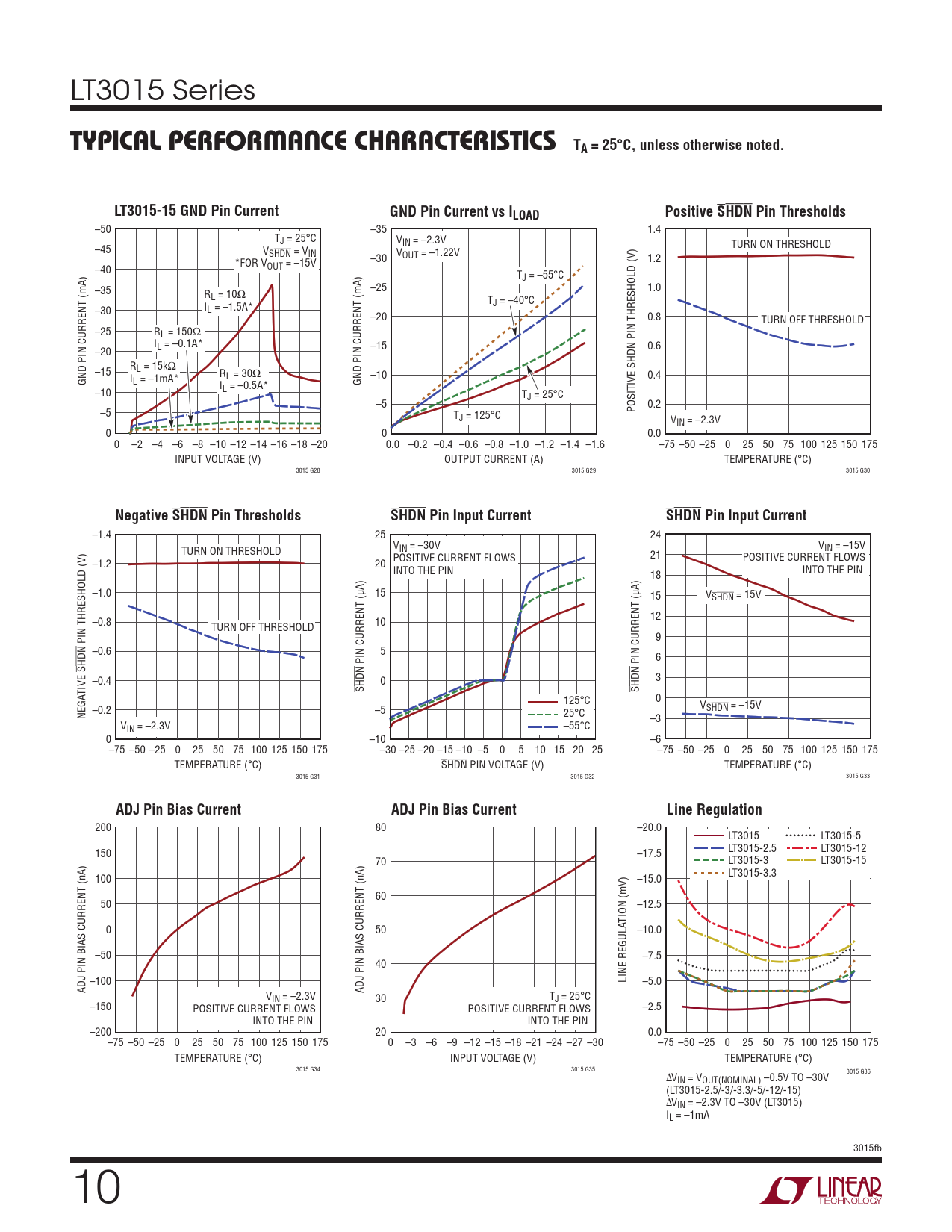–50 –35 1.4 TJ = 25°C VIN = –2.3V TURN ON THRESHOLD –45 VSHDN = VIN –30 VOUT = –1.22V 1.2 –40 *FOR VOUT = –15V TJ = –55°C –25 1.0 –35 RL = 10Ω TJ = –40°C –30 IL = –1.5A* –20 0.8 TURN OFF THRESHOLD –25 RL = 150Ω PIN THRESHOLD (V) IL = –0.1A* –15 0.6 –20 R SHDN –15 L = 15kΩ R GND PIN CURRENT (mA) L = 30Ω IL = –1mA* GND PIN CURRENT (mA) –10 0.4 I –10 L = –0.5A* TJ = 25°C –5 0.2 –5 T POSITIVE J = 125°C VIN = –2.3V 0 0 0.0 0 –2 –4 –6 –8 –10 –12 –14 –16 –18 –20 0.0 –0.2 –0.4 –0.6 –0.8 –1.0 –1.2 –1.4 –1.6 –75 –50 –25 0 25 50 75 100 125 150 175 INPUT VOLTAGE (V) OUTPUT CURRENT (A) TEMPERATURE (°C) 3015 G28 3015 G29 3015 G30