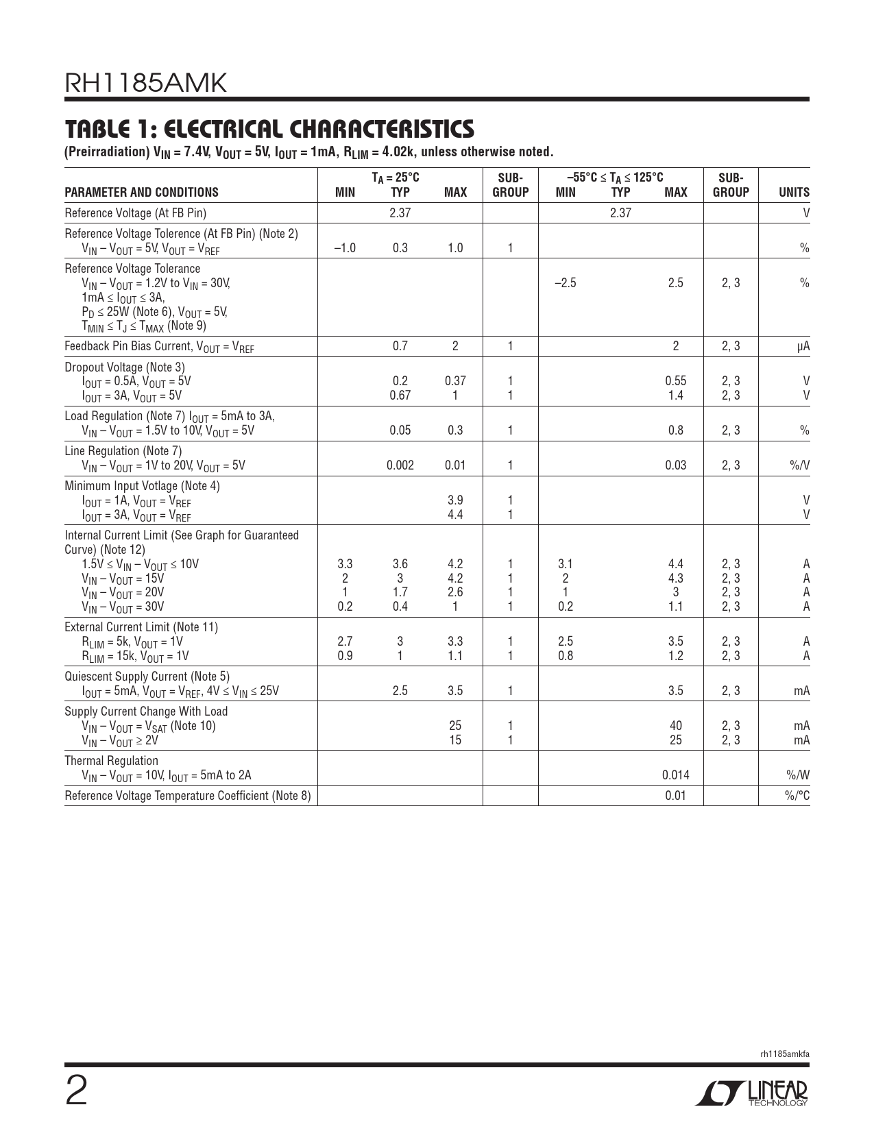 TABLE 1: ELECTRICAL CHARACTERISTICS (Preirradiation) VIN = 7.4V, VOUT = 5V, IOUT = 1mA, RLIM = 4.02k, unless otherwise noted. TA = 25°C SUB- –55°C ≤ T A ≤ 125°C SUB- PARAMETER AND CONDITIONS MIN TYP MAX GROUP MIN TYP MAX GROUP UNITS