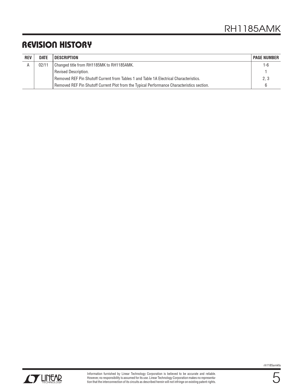 RH1185AMK REVISION HISTORYREVDATEDESCRIPTIONPAGE NUMBER A 02/11 Changed title from RH1185MK to RH1185AMK. 1-6 Revised Description. 1 Removed REF Pin Shutoff Current from Tables 1 and Table 1A Electrical Characteristics. 2, 3 Removed REF Pin Shutoff Current Plot from the Typical Performance Characteristics section. 6 rh1185amkfa Information furnished by Linear Technology Corporation is believed to be accurate and reliable. However, no responsibility is assumed for its use. Linear Technology Corporation makes no representa- tion that the interconnection of its circuits as described herein will not infringe on existing patent rights. 5 Document Outline Description Electrical Characteristics