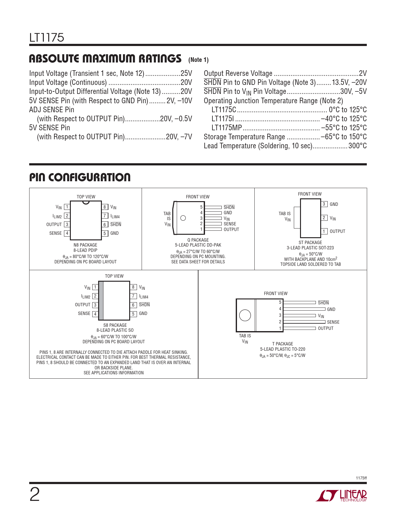 LT1175 ABSOLUTE MAXIMUM RATINGS (Note 1) Input Voltage (Transient 1 sec, Note 12) ...25V Output Reverse Voltage ..2V Input Voltage (Continuous) ...20V SHDN Pin to GND Pin Voltage (Note 3) ..13.5V, –20V Input-to-Output Differential Voltage (Note 13) ..20V SHDN Pin to VIN Pin Voltage ...30V, –5V 5V SENSE Pin (with Respect to GND Pin) ... 2V, –10V Operating Junction Temperature Range (Note 2) ADJ SENSE Pin LT1175C ... 0°C to 125°C (with Respect to OUTPUT Pin) ...20V, –0.5V LT1175I .. –40°C to 125°C 5V SENSE Pin LT1175MP .. –55°C to 125°C (with Respect to OUTPUT Pin) ..20V, –7V Storage Temperature Range .. –65°C to 150°C Lead Temperature (Soldering, 10 sec)... 300°C PIN CONFIGURATION FRONT VIEW TOP VIEW FRONT VIEW 3 GND VIN 1 8 VIN 5 SHDN TAB 4 GND I TAB IS LIM2 2 7 ILIM4 IS 3 VIN 2 V V IN IN OUTPUT 3 6 SHDN V 2 SENSE IN 1 OUTPUT SENSE 4 1 5 GND OUTPUT Q PACKAGE ST PACKAGE N8 PACKAGE 5-LEAD PLASTIC DD-PAK 3-LEAD PLASTIC SOT-223 8-LEAD PDIP θJA = 27°C/W TO 60°C/W θ θJA = 50°C/W JA = 80°C/W TO 120°C/W DEPENDING ON PC MOUNTING. WITH BACKPLANE AND 10cm2 DEPENDING ON PC BOARD LAYOUT SEE DATA SHEET FOR DETAILS TOPSIDE LAND SOLDERED TO TAB TOP VIEW V 1 8 IN VIN FRONT VIEW ILIM2 2 7 ILIM4 5 SHDN OUTPUT 3 6 SHDN 4 GND SENSE 4 5 GND 3 VIN 2 SENSE S8 PACKAGE 8-LEAD PLASTIC SO 1 OUTPUT θ TAB IS JA = 60°C/W TO 100°C/W DEPENDING ON PC BOARD LAYOUT VIN T PACKAGE 5-LEAD PLASTIC TO-220 PINS 1, 8 ARE INTERNALLY CONNECTED TO DIE ATTACH PADDLE FOR HEAT SINKING. θ ELECTRICAL CONTACT CAN BE MADE TO EITHER PIN. FOR BEST THERMAL RESISTANCE, JA = 50°C/W, θJC = 5°C/W PINS 1, 8 SHOULD BE CONNECTED TO AN EXPANDED LAND THAT IS OVER AN INTERNAL OR BACKSIDE PLANE. SEE APPLICATIONS INFORMATION 1175ff 2