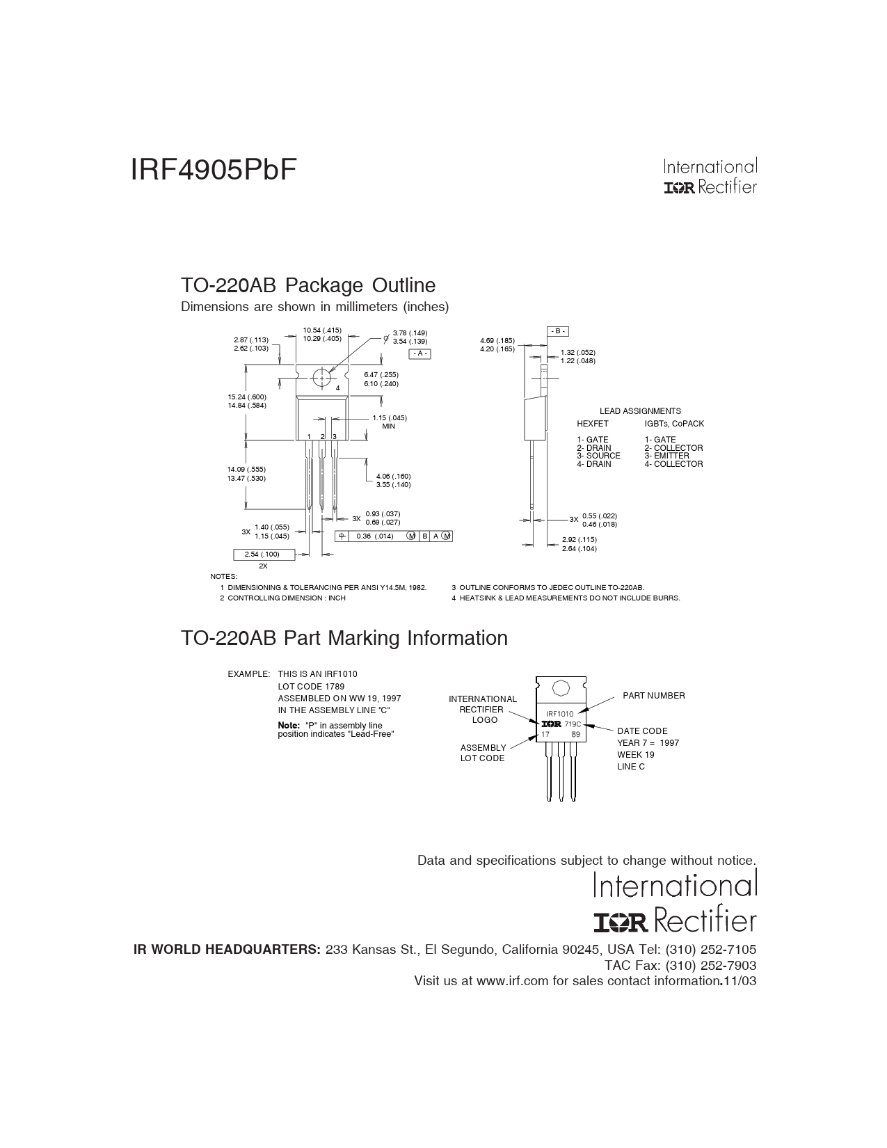 IRF4905PbF TO-220AB Package Outline Dimensions are shown in millimeters (inches) 10.54 (.415) - B - 3.78 (.149) 2.87 (.113) 10.29 (.405) 3.54 (.139) 4.69 (.185) 2.62 (.103) 4.20 (.165) - A - 1.32 (.052) 1.22 (.048) 6.47 (.255) 6.10 (.240) 4 15.24 (.600) 14.84 (.584) LEAD ASSIGNMENTS 1.15 (.045) LEAD ASSIGNMENTS MIN HEXFET IGBTs, CoPACK 1 - GATE 1 2 3 2 - DRAIN 1- GATE 1- GATE 2- 3 DRA - I S N OURCE 2- COLLECTOR 3- S O 4 - UR DR CEAIN 3- EMITTER 4- DRAIN 4- COLLECTOR 14.09 (.555) 4.06 (.160) 13.47 (.530) 3.55 (.140) 0.93 (.037) 3X 3X 0.55 (.022) 0.69 (.027) 0.46 (.018) 1.40 (.055) 3X 1.15 (.045) 0.36 (.014) M B A M 2.92 (.115) 2.64 (.104) 2.54 (.100) 2X NOTES: 1 DIMENSIONING & TOLERANCING PER ANSI Y14.5M, 1982. 3 OUTLINE CONFORMS TO JEDEC OUTLINE TO-220AB. 2 CONTROLLING DIMENSION : INCH 4 HEATSINK & LEAD MEASUREMENTS DO NOT INCLUDE BURRS. TO-220AB Part Marking Information EXAMPLE: THIS IS AN IRF1010 LOT CODE 1789 ASSEMBLED ON WW 19, 1997 PART NUMBER INTERNATIONAL IN THE ASSEMBLY LINE "C" RECTIFIER LOGO Note: "P" in assembly line DATE CODE position indicates "Lead-Free" ASSEMBLY YEAR 7 = 1997 LOT CODE WEEK 19 LINE C Data and specifications subject to change without notice. IR WORLD HEADQUARTERS: 233 Kansas St., El Segundo, California 90245, USA Tel: (310) 252-7105 TAC Fax: (310) 252-7903 Visit us at www.irf.com for sales contact information . 11/03