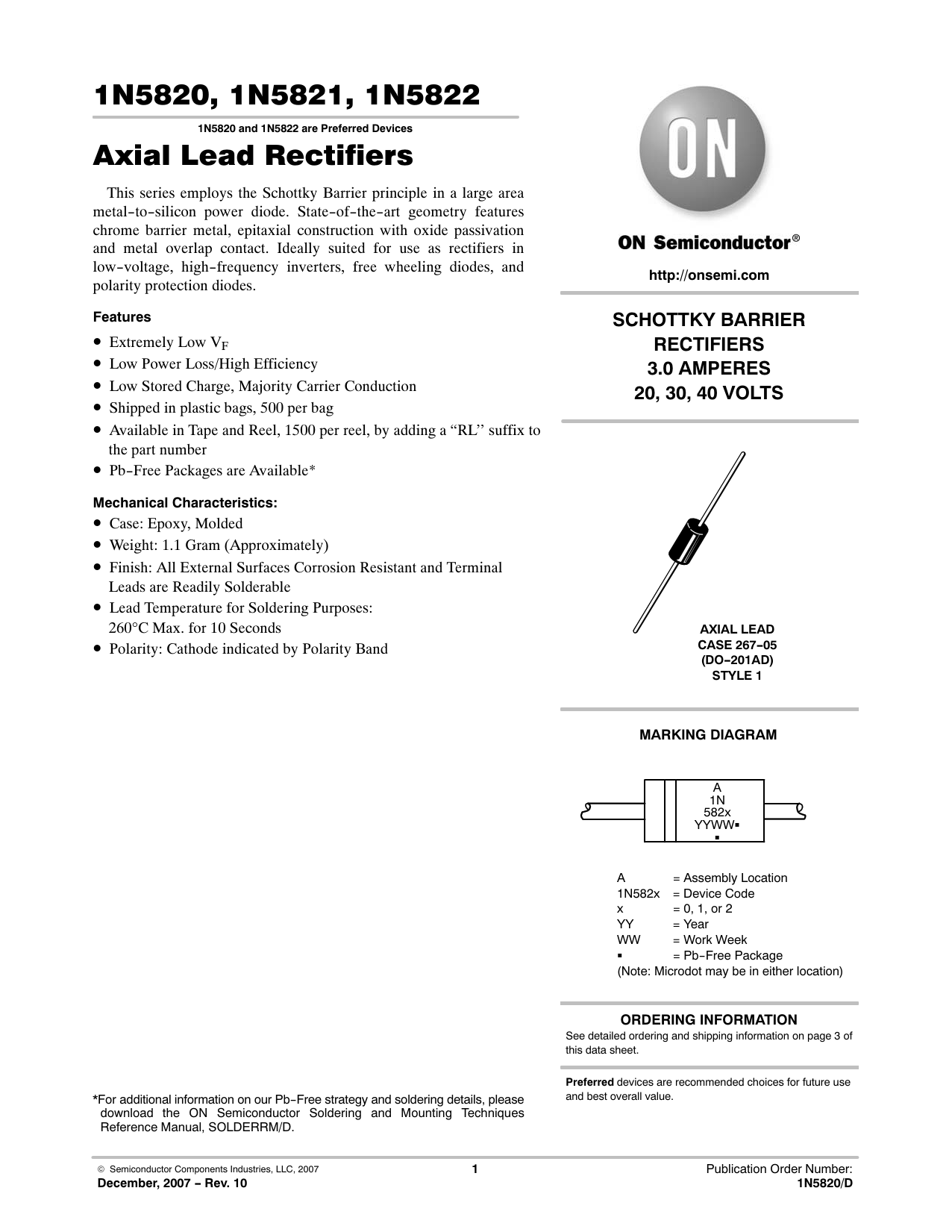 1N5820 and 1N5822 are Preferred Devices. http://onsemi.com. Features. SCHOTTKY BARRIER. RECTIFIERS. 3.0 AMPERES. 20, 30, 40 VOLTS