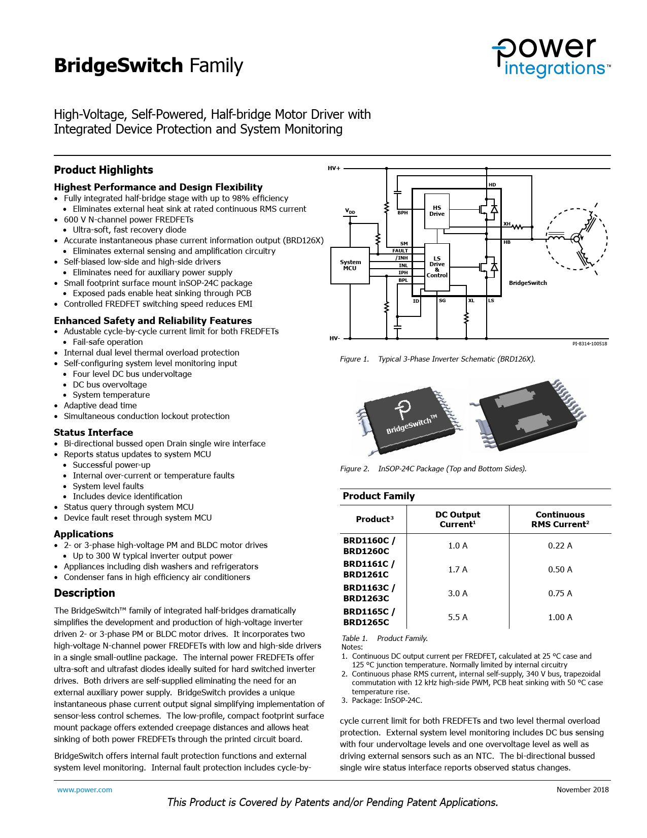 BridgeSwitch Family High-Voltage, Self-Powered, Half-bridge Motor Driver with Integrated Device Protection and System Monitoring Product HighlightsHV+Highest Performance and Design FlexibilityHD • Fully integrated half-bridge stage with up to 98% efficiency • Eliminates external heat sink at rated continuous RMS current VHSDDBPHDrive • 600 V N-channel power FREDFETs XH • Ultra-soft, fast recovery diode • Accurate instantaneous phase current information output (BRD126X) HBSM • Eliminates external sensing and amplification circuitry FAULT • Self-biased low-side and high-side drivers /INHSystemLSINLDrive • Eliminates need for auxiliary power supply MCU&IPHControl • Small footprint surface mount inSOP-24C package BPLBridgeSwitch • Exposed pads enable heat sinking through PCB • Control ed FREDFET switching speed reduces EMI IDSGXLLSEnhanced Safety and Reliability Features • Adustable cycle-by-cycle current limit for both FREDFETs • Fail-safe operation HV- PI-8314-100518 • Internal dual level thermal overload protection • Self-configuring system level monitoring input Figure 1. Typical 3-Phase Inverter Schematic (BRD126X). • Four level DC bus undervoltage • DC bus overvoltage • System temperature • Adaptive dead time • Simultaneous conduction lockout protection TMStatus InterfaceBridgeSwitch • Bi-directional bussed open Drain single wire interface • Reports status updates to system MCU • Successful power-up Figure 2. InSOP-24C Package (Top and Bottom Sides). • Internal over-current or temperature faults • System level faults • Includes device identification Product Family • Status query through system MCU • Device fault reset through system MCU ProductDC OutputContinuous3Current1RMS Current2Applications • 2- or 3-phase high-voltage PM and BLDC motor drives BRD1160C / • Up to 300 W typical inverter output power BRD1260C 1.0 A 0.22 A • Appliances including dish washers and refrigerators BRD1161C / • Condenser fans in high efficiency air conditioners BRD1261C 1.7 A 0.50 A DescriptionBRD1163C /BRD1263C 3.0 A 0.75 A The BridgeSwitch™ family of integrated half-bridges dramatically BRD1165C / simplifies the development and production of high-voltage inverter BRD1265C 5.5 A 1.00 A driven 2- or 3-phase PM or BLDC motor drives. It incorporates two Table 1. Product Family. high-voltage N-channel power FREDFETs with low and high-side drivers Notes: in a single smal -outline package. The internal power FREDFETs offer 1. Continuous DC output current per FREDFET, calculated at 25 °C case and ultra-soft and ultrafast diodes ideal y suited for hard switched inverter 125 °C junction temperature. Normal y limited by internal circuitry 2. Continuous phase RMS current, internal self-supply, 340 V bus, trapezoidal drives. Both drivers are self-supplied eliminating the need for an commutation with 12 kHz high-side PWM, PCB heat sinking with 50 °C case external auxiliary power supply. BridgeSwitch provides a unique temperature rise. instantaneous phase current output signal simplifying implementation of 3. Package: InSOP-24C. sensor-less control schemes. The low-profile, compact footprint surface cycle current limit for both FREDFETs and two level thermal overload mount package offers extended creepage distances and al ows heat protection. External system level monitoring includes DC bus sensing sinking of both power FREDFETs through the printed circuit board. with four undervoltage levels and one overvoltage level as well as BridgeSwitch offers internal fault protection functions and external driving external sensors such as an NTC. The bi-directional bussed system level monitoring. Internal fault protection includes cycle-by- single wire status interface reports observed status changes. www.power.com November 2018 This Product is Covered by Patents and/or Pending Patent Applications. Document Outline Product Highlights Description Output Power Table Pin Functional Description BridgeSwitch Functional Description Application Example PCB Design Guidelines Absolute Maximum Ratings Thermal Resistance Key Electrical Characteristics Typical Performance Characteristics inSOP-24C Package Drawing Package Marking Part Ordering and MSL Table ESD and Latch-Up Table Part Ordering Information