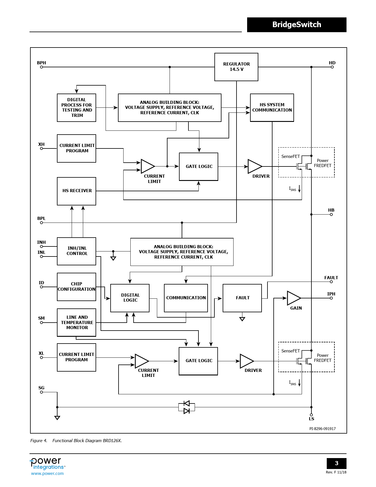 BridgeSwitch BPH REGULATOR HD 14.5 V DIGITAL ANALOG BUILDING BLOCK: PROCESS FOR HS SYSTEM VOLTAGE SUPPLY, REFERENCE VOLTAGE, TESTING AND COMMUNICATION REFERENCE CURRENT, CLK TRIM XH CURRENT LIMIT PROGRAM