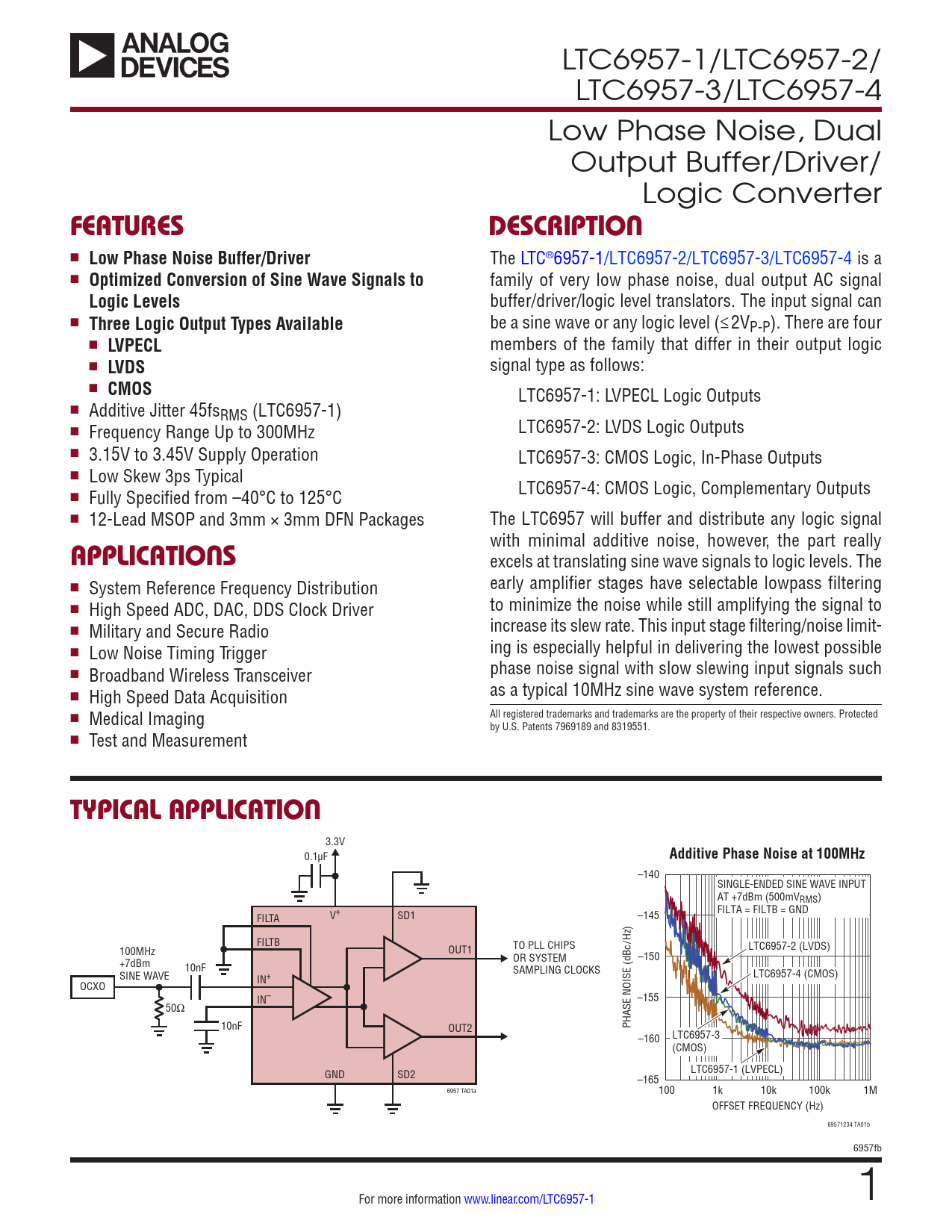 LTC6957-1/LTC6957-2/ LTC6957-3/LTC6957-4 Low Phase Noise, Dual Output Buffer/Driver/ Logic Converter FEATURESDESCRIPTION n Low Phase Noise Buffer/Driver The LTC®6957-1/LTC6957-2/LTC6957-3/LTC6957-4 is a n Optimized Conversion of Sine Wave Signals to family of very low phase noise, dual output AC signal Logic Levels buffer/driver/logic level translators. The input signal can n Three Logic Output Types Available be a sine wave or any logic level (≤2VP-P). There are four n LVPECL members of the family that differ in their output logic n LVDS signal type as follows: n CMOS LTC6957-1: LVPECL Logic Outputs n Additive Jitter 45fsRMS (LTC6957-1) n LTC6957-2: LVDS Logic Outputs Frequency Range Up to 300MHz n 3.15V to 3.45V Supply Operation LTC6957-3: CMOS Logic, In-Phase Outputs n Low Skew 3ps Typical LTC6957-4: CMOS Logic, Complementary Outputs n Fully Specified from –40°C to 125°C n 12-Lead MSOP and 3mm × 3mm DFN Packages The LTC6957 will buffer and distribute any logic signal with minimal additive noise, however, the part really APPLICATIONS excels at translating sine wave signals to logic levels. The n early amplifier stages have selectable lowpass filtering System Reference Frequency Distribution n to minimize the noise while still amplifying the signal to High Speed ADC, DAC, DDS Clock Driver n increase its slew rate. This input stage filtering/noise limit- Military and Secure Radio n ing is especially helpful in delivering the lowest possible Low Noise Timing Trigger n phase noise signal with slow slewing input signals such Broadband Wireless Transceiver n as a typical 10MHz sine wave system reference. High Speed Data Acquisition n All registered trademarks and trademarks are the property of their respective owners. Protected Medical Imaging by U.S. Patents 7969189 and 8319551. n Test and Measurement TYPICAL APPLICATION 3.3V 0.1µF Additive Phase Noise at 100MHz –140 SINGLE-ENDED SINE WAVE INPUT AT +7dBm (500mVRMS) V+ SD1 –145 FILTA = FILTB = GND FILTA FILTB /Hz) TO PLL CHIPS LTC6957-2 (LVDS) 100MHz OUT1 OR SYSTEM –150 +7dBm 10nF SINE WAVE SAMPLING CLOCKS LTC6957-4 (CMOS) IN+ OCXO IN– –155 50Ω 10nF PHASE NOISE (dBc OUT2 –160 LTC6957-3 (CMOS) LTC6957-1 (LVPECL) GND SD2 –165 6957 TA01a 100 1k 10k 100k 1M OFFSET FREQUENCY (Hz) 69571234 TA01b 6957fb For more information www.linear.com/LTC6957-1 1 Document Outline Features Applications Typical Application Description Absolute Maximum Ratings Pin Configuration Order Information Electrical Characteristics Typical Performance Characteristics Pin Functions Block Diagrams Timing Diagram Applications Information Typical Applications Package Description Revision History Typical Application Related Parts