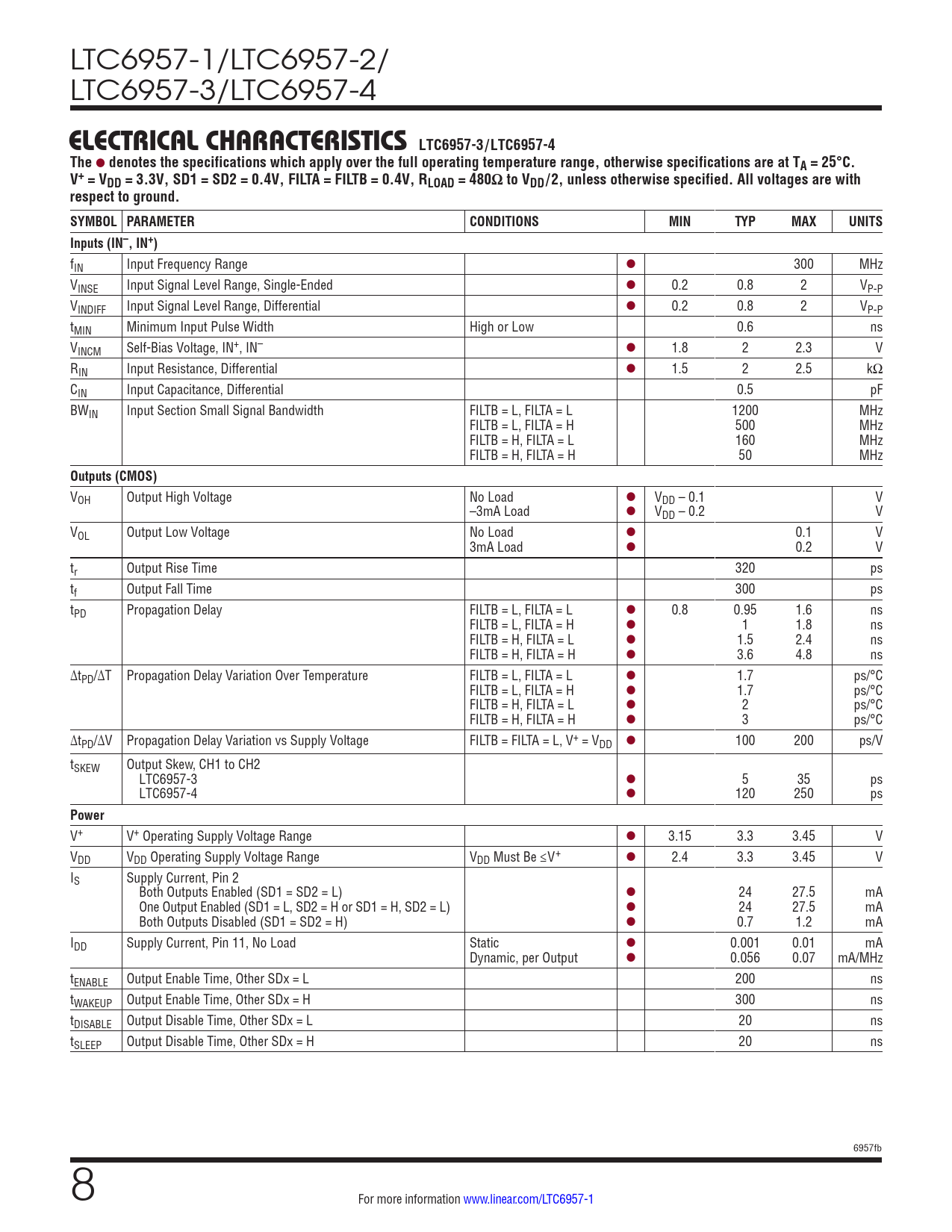 LTC6957-1/LTC6957-2/ LTC6957-3/LTC6957-4 ELECTRICAL CHARACTERISTICS LTC6957-3/LTC6957-4The l denotes the specifications which apply over the full operating temperature range, otherwise specifications are at TA = 25°C.V+ = VDD = 3.3V, SD1 = SD2 = 0.4V, FILTA = FILTB = 0.4V, RLOAD = 480Ω to VDD/2, unless otherwise specified. All voltages are withrespect to ground. SYMBOL PARAMETERCONDITIONSMINTYPMAXUNITSInputs (IN–, IN+) fIN Input Frequency Range l 300 MHz VINSE Input Signal Level Range, Single-Ended l 0.2 0.8 2 VP-P VINDIFF Input Signal Level Range, Differential l 0.2 0.8 2 VP-P tMIN Minimum Input Pulse Width High or Low 0.6 ns VINCM Self-Bias Voltage, IN+, IN– l 1.8 2 2.3 V RIN Input Resistance, Differential l 1.5 2 2.5 kΩ CIN Input Capacitance, Differential 0.5 pF BWIN Input Section Small Signal Bandwidth FILTB = L, FILTA = L 1200 MHz FILTB = L, FILTA = H 500 MHz FILTB = H, FILTA = L 160 MHz FILTB = H, FILTA = H 50 MHz Outputs (CMOS) VOH Output High Voltage No Load l VDD – 0.1 V –3mA Load l VDD – 0.2 V VOL Output Low Voltage No Load l 0.1 V 3mA Load l 0.2 V tr Output Rise Time 320 ps tf Output Fall Time 300 ps tPD Propagation Delay FILTB = L, FILTA = L l 0.8 0.95 1.6 ns FILTB = L, FILTA = H l 1 1.8 ns FILTB = H, FILTA = L l 1.5 2.4 ns FILTB = H, FILTA = H l 3.6 4.8 ns ∆tPD/∆T Propagation Delay Variation Over Temperature FILTB = L, FILTA = L l 1.7 ps/°C FILTB = L, FILTA = H l 1.7 ps/°C FILTB = H, FILTA = L l 2 ps/°C FILTB = H, FILTA = H l 3 ps/°C ∆tPD/∆V Propagation Delay Variation vs Supply Voltage FILTB = FILTA = L, V+ = VDD l 100 200 ps/V tSKEW Output Skew, CH1 to CH2 LTC6957-3 l 5 35 ps LTC6957-4 l 120 250 ps Power V+ V+ Operating Supply Voltage Range l 3.15 3.3 3.45 V VDD VDD Operating Supply Voltage Range VDD Must Be ≤V+ l 2.4 3.3 3.45 V IS Supply Current, Pin 2 Both Outputs Enabled (SD1 = SD2 = L) l 24 27.5 mA One Output Enabled (SD1 = L, SD2 = H or SD1 = H, SD2 = L) l 24 27.5 mA Both Outputs Disabled (SD1 = SD2 = H) l 0.7 1.2 mA IDD Supply Current, Pin 11, No Load Static l 0.001 0.01 mA Dynamic, per Output l 0.056 0.07 mA/MHz tENABLE Output Enable Time, Other SDx = L 200 ns tWAKEUP Output Enable Time, Other SDx = H 300 ns tDISABLE Output Disable Time, Other SDx = L 20 ns tSLEEP Output Disable Time, Other SDx = H 20 ns 6957fb 8 For more information www.linear.com/LTC6957-1 Document Outline Features Applications Typical Application Description Absolute Maximum Ratings Pin Configuration Order Information Electrical Characteristics Typical Performance Characteristics Pin Functions Block Diagrams Timing Diagram Applications Information Typical Applications Package Description Revision History Typical Application Related Parts