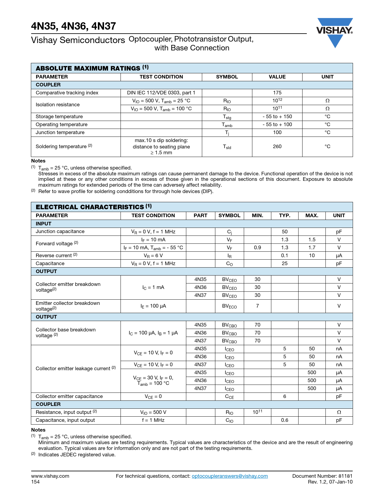 (1) Tamb = 25 °C, unless otherwise specified. Minimum and maximum values are testing requirements. Typical values are characteristics of the device and are the result of engineering evaluation. Typical values are for information only and are not part of the testing requirements. (2) Indicates JEDEC registered value. www.vishay.com For technical questions, contact: optocoupleranswers@vishay.com Document Number: 81181 154 Rev. 1.2, 07-Jan-10