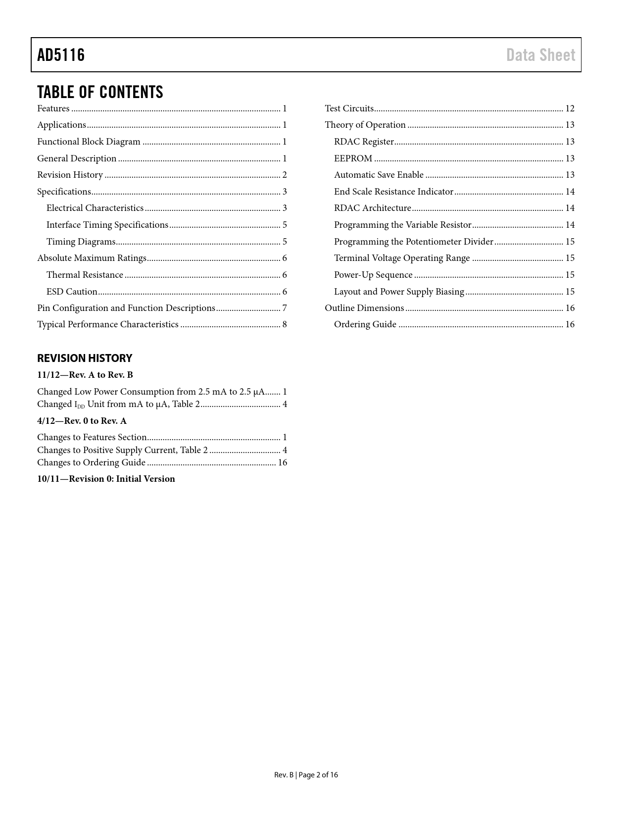 Pages / Page16 / 2 — AD5116. Data Sheet. TABLE OF CONTENTS. REVISION HISTORY 11/12—Rev. A to …