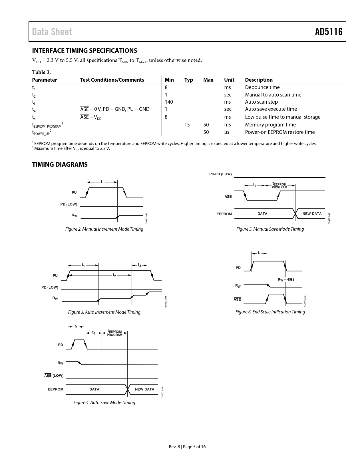link to page 5 link to page 5 Data SheetAD5116INTERFACE TIMING SPECIFICATIONS VDD = 2.3 V to 5.5 V; all specifications TMIN to TMAX, unless otherwise noted. Table 3. ParameterTest Conditions/CommentsMinTypMaxUnitDescription t 8 ms Debounce time 1 t 1 sec Manual to auto scan time 2 t 140 ms Auto scan step 3 t 4 ASE = 0 V, PD = GND, PU = GND 1 sec Auto save execute time t 8 ms Low pulse time to manual storage 5 ASE = VDD t 1 15 50 ms Memory program time EEPROM_PROGRAM t 2 50 µs Power-on EEPROM restore time POWER_UP 1 EEPROM program time depends on the temperature and EEPROM write cycles. Higher timing is expected at a lower temperature and higher write cycles. 2 Maximum time after VDD is equal to 2.3 V. TIMING DIAGRAMSPD/PU (LOW)t1ttEEPROM5PROGRAMPUASEPD (LOW)REEPROMDATANEW DATAW 002 005 09657- 09657- Figure 2. Manual Increment Mode Timing Figure 5. Manual Save Mode Timing t1tt13PDPUt2RW = 45ΩRPD (LOW)WRW 003 006 ASE 09657- 09657- Figure 3. Auto Increment Mode Timing Figure 6. End Scale Indication Timing t1ttEEPROM4PROGRAMPDRWASE (LOW)EEPROMDATANEW DATA 004 09657- Figure 4. Auto Save Mode Timing Rev. B | Page 5 of 16 Document Outline Features Applications Functional Block Diagram General Description Revision History Specifications Electrical Characteristics Interface Timing Specifications Timing Diagrams Absolute Maximum Ratings Thermal Resistance ESD Caution Pin Configuration and Function Descriptions Typical Performance Characteristics Test Circuits Theory of Operation RDAC Register Manual Increment Auto Scan Increment Low Wiper Resistance Feature EEPROM Automatic Save Enable Auto Save Manual Store End Scale Resistance Indicator RDAC Architecture Top Scale/Bottom Scale Architecture Programming the Variable Resistor Rheostat Operation—±8% Resistor Tolerance Programming the Potentiometer Divider Voltage Output Operation Terminal Voltage Operating Range Power-Up Sequence Layout and Power Supply Biasing Outline Dimensions Ordering Guide