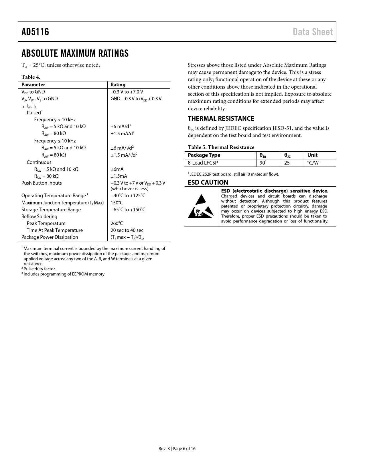 AD5116 Data Sheet ABSOLUTE MAXIMUM RATINGS Table 4 Parameter Rating THERMAL RESISTANCE Table 5 Thermal Resistance Package Type