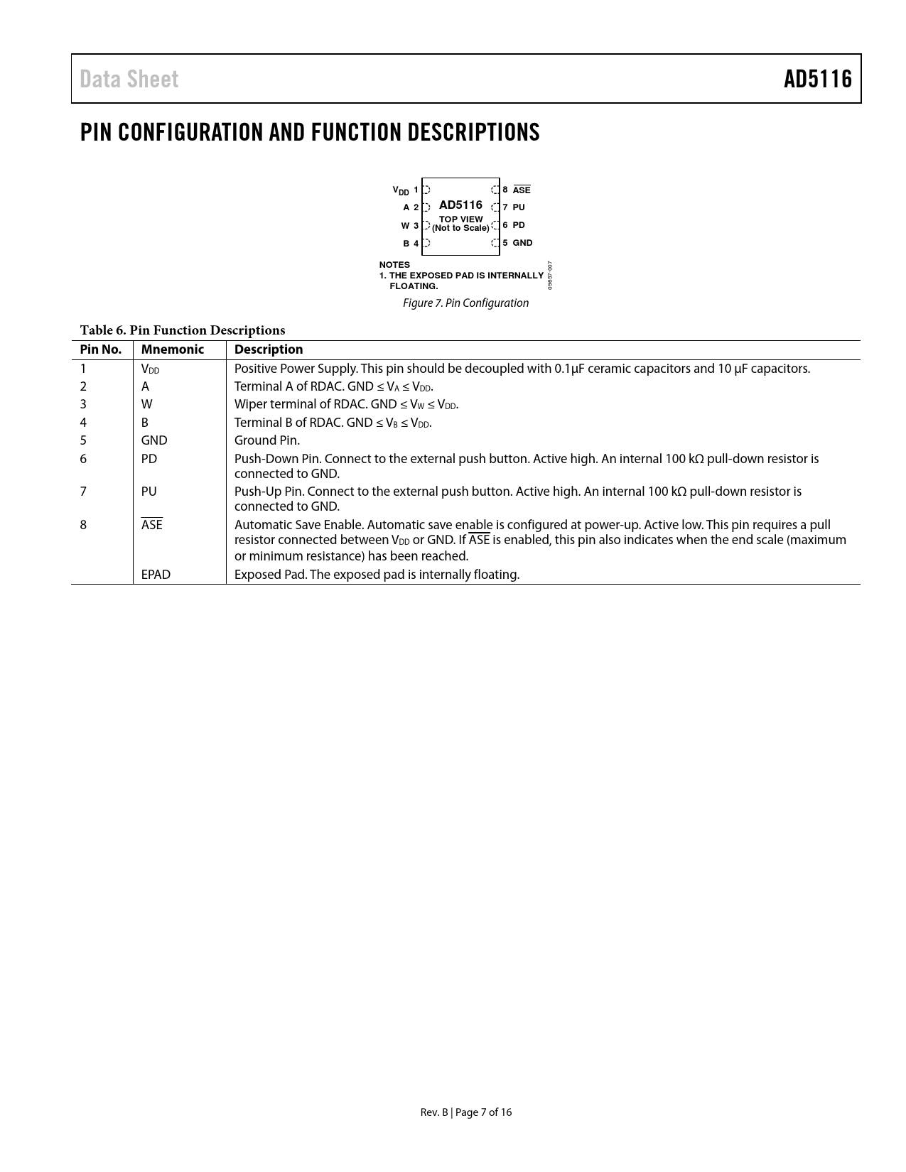 Data Sheet. AD5116. PIN CONFIGURATION AND FUNCTION DESCRIPTIONS. 8 ASE. A 2. 7 PU. TOP VIEW. W 3. (Not to Scale). 6 PD. B 4. 5 GND. NOTES
