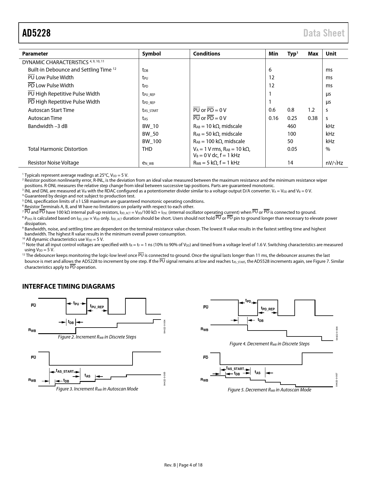 DYNAMIC CHARACTERISTICS 4, 9, 10, 11 Built-in Debounce and Settling Time 12 tDB 6 ms PU Low Pulse Width tPU 12 ms PD Low Pulse Width tPD 12 ms PU High Repetitive Pulse Width tPU_REP 1 μs PD High Repetitive Pulse Width tPD_REP 1 μs Autoscan Start Time tAS_START PU or PD = 0 V 0.6 0.8 1.2 s Autoscan Time tAS PU or PD = 0 V 0.16 0.25 0.38 s Bandwidth –3 dB BW_10 RAB = 10 kΩ, midscale 460 kHz BW_50 RAB = 50 kΩ, midscale 100 kHz BW_100 RAB = 100 kΩ, midscale 50 kHz Total Harmonic Distortion THD VA = 1 V rms, RAB = 10 kΩ, 0.05 % VB = 0 V dc, f = 1 kHz Resistor Noise Voltage eN_WB RWB = 5 kΩ, f = 1 kHz 14 nV/√Hz 1 Typicals represent average readings at 25°C, VDD = 5 V. 2 Resistor position nonlinearity error, R-INL, is the deviation from an ideal value measured between the maximum resistance and the minimum resistance wiper positions. R-DNL measures the relative step change from ideal between successive tap positions. Parts are guaranteed monotonic. 3 INL and DNL are measured at VW with the RDAC configured as a potentiometer divider similar to a voltage output D/A converter. VA = VDD and VB = 0 V. 4 Guaranteed by design and not subject to production test. 5 DNL specification limits of ±1 LSB maximum are guaranteed monotonic operating conditions. 6 Resistor Terminals A, B, and W have no limitations on polarity with respect to each other. 7 PU and PD have 100 kΩ internal pull-up resistors, IDD_ACT = VDD/100 kΩ + IOSC (internal oscillator operating current) when PU or PD is connected to ground. 8 PDISS is calculated based on IDD_STBY × VDD only. IDD_ACT duration should be short. Users should not hold PU or PD pin to ground longer than necessary to elevate power dissipation. 9 Bandwidth, noise, and settling time are dependent on the terminal resistance value chosen. The lowest R value results in the fastest settling time and highest bandwidth. The highest R value results in the minimum overall power consumption. 10 All dynamic characteristics use VDD = 5 V. 11 Note that all input control voltages are specified with tR = tF = 1 ns (10% to 90% of VDD) and timed from a voltage level of 1.6 V. Switching characteristics are measured using VDD = 5 V. 12 The debouncer keeps monitoring the logic-low level once PU is connected to ground. Once the signal lasts longer than 11 ms, the debouncer assumes the last bounce is met and allows the AD5228 to increment by one step. If the PU signal remains at low and reaches tAS_START, the AD5528 increments again, see Figure 7. Similar characteristics apply to PD operation.