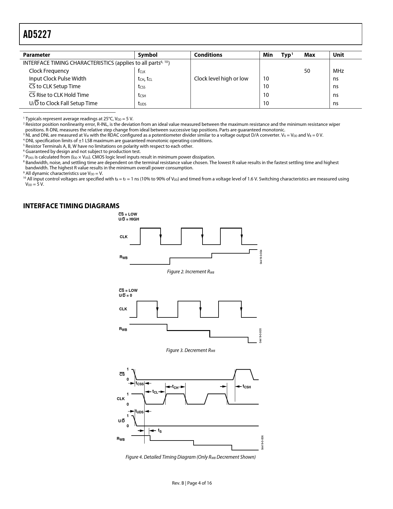 AD5227. Parameter Symbol. Conditions. Min. Typ1. Max Unit. INTERFACE TIMING DIAGRAMS. CS = LOW U/D = HIGH. CLK. RWB. CS = LOW U/D = 0. tCSS