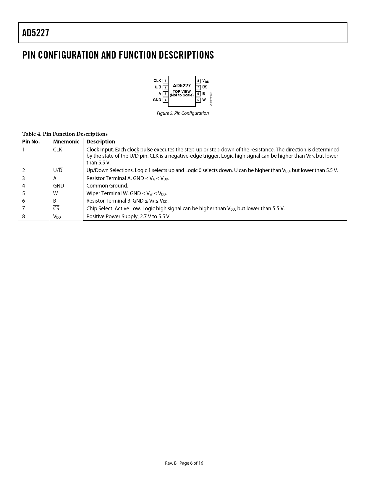 Pages / Page16 / 6 — AD5227. PIN CONFIGURATION AND FUNCTION DESCRIPTIONS. CLK. VDD. U/D. TOP …
