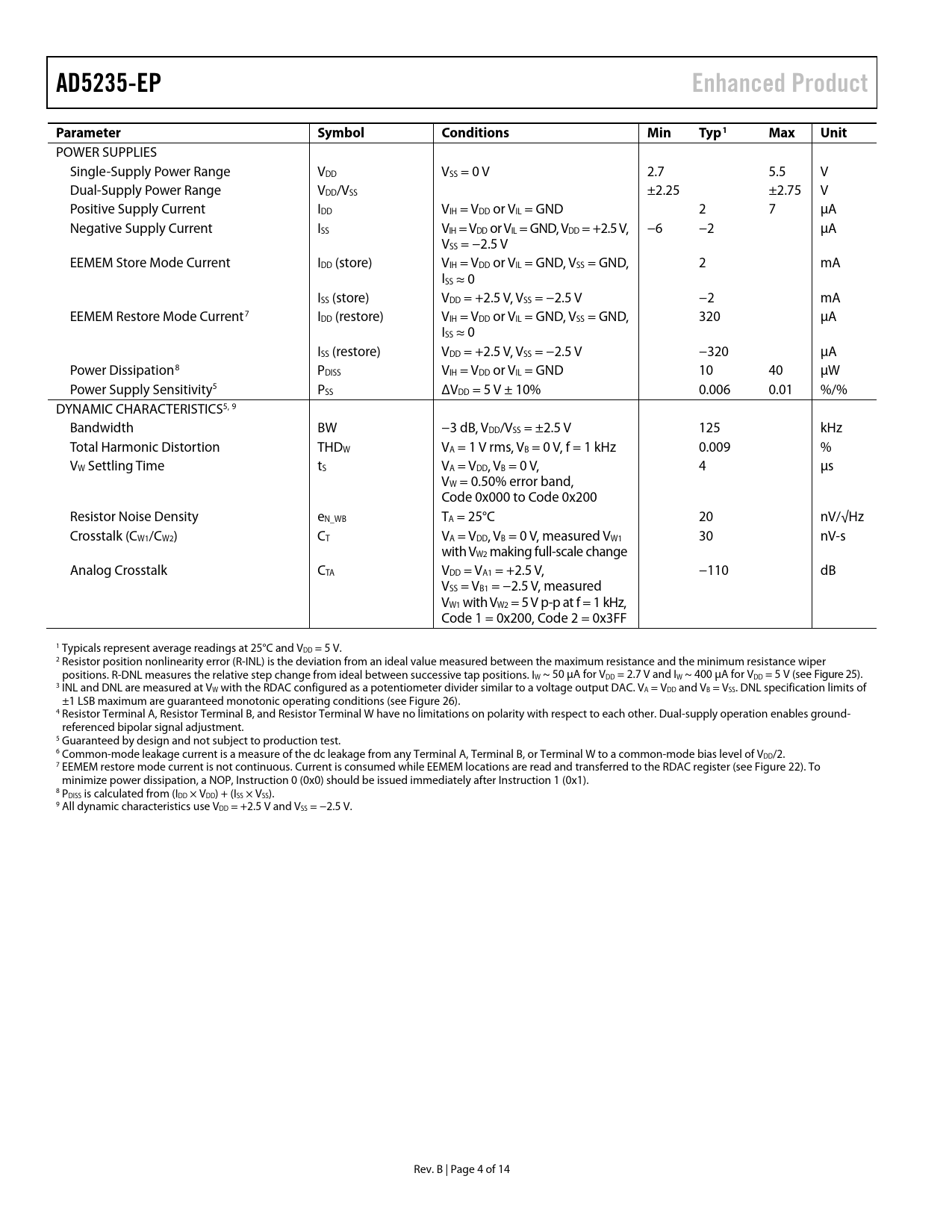Pages / Page14 / 4 — AD5235-EP. Enhanced Product. Parameter. Symbol. Conditions. Min. Typ1. …