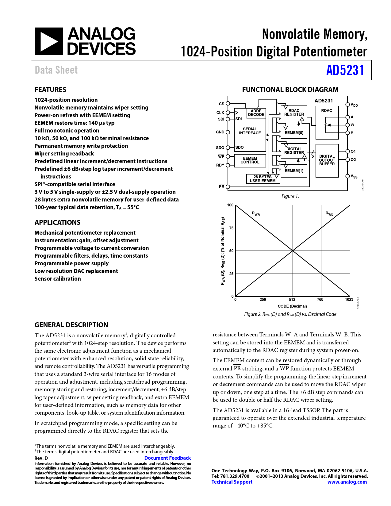 Nonvolatile Memory,. 1024-Position Digital Potentiometer. Data Sheet. AD5231. FEATURES. FUNCTIONAL BLOCK DIAGRAM