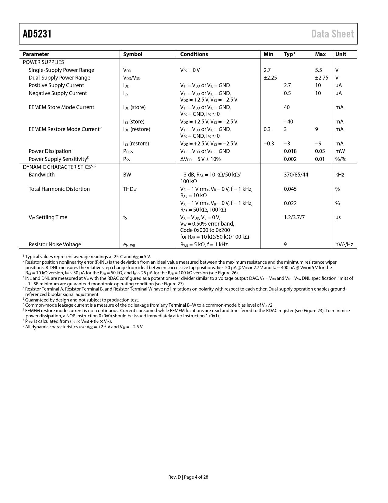 link to page 13 link to page 13 link to page 11 link to page 4 link to page 4 link to page 4 link to page 4 link to page 4 AD5231Data SheetParameterSymbolConditionsMinTyp1MaxUnit POWER SUPPLIES Single-Supply Power Range VDD VSS = 0 V 2.7 5.5 V Dual-Supply Power Range VDD/VSS ±2.25 ±2.75 V Positive Supply Current IDD VIH = VDD or VIL = GND 2.7 10 µA Negative Supply Current ISS VIH = VDD or VIL = GND, 0.5 10 µA VDD = +2.5 V, VSS = −2.5 V EEMEM Store Mode Current IDD (store) VIH = VDD or VIL = GND, 40 mA VSS = GND, ISS ≈ 0 ISS (store) VDD = +2.5 V, VSS = −2.5 V −40 mA EEMEM Restore Mode Current7 IDD (restore) VIH = VDD or VIL = GND, 0.3 3 9 mA VSS = GND, ISS ≈ 0 ISS (restore) VDD = +2.5 V, VSS = −2.5 V −0.3 −3 −9 mA Power Dissipation8 PDISS VIH = VDD or VIL = GND 0.018 0.05 mW Power Supply Sensitivity5 PSS ΔVDD = 5 V ± 10% 0.002 0.01 %/% DYNAMIC CHARACTERISTICS5, 9 Bandwidth BW −3 dB, RAB = 10 kΩ/50 kΩ/ 370/85/44 kHz 100 kΩ Total Harmonic Distortion THDW VA = 1 V rms, VB = 0 V, f = 1 kHz, 0.045 % RAB = 10 kΩ VA = 1 V rms, VB = 0 V, f = 1 kHz, 0.022 % RAB = 50 kΩ, 100 kΩ VW Settling Time tS VA = VDD, VB = 0 V, 1.2/3.7/7 µs VW = 0.50% error band, Code 0x000 to 0x200 for RAB = 10 kΩ/50 kΩ/100 kΩ Resistor Noise Voltage eN_WB RWB = 5 kΩ, f = 1 kHz 9 nV/√Hz 1 Typical values represent average readings at 25°C and VDD = 5 V. 2 Resistor position nonlinearity error (R-INL) is the deviation from an ideal value measured between the maximum resistance and the minimum resistance wiper positions. R-DNL measures the relative step change from ideal between successive tap positions. IW ~ 50 µA @ VDD = 2.7 V and IW ~ 400 µA @ VDD = 5 V for the RAB = 10 kΩ version, IW ~ 50 µA for the RAB = 50 kΩ, and IW ~ 25 µA for the RAB = 100 kΩ version (see Figure 26). 3 INL and DNL are measured at VW with the RDAC configured as a potentiometer divider similar to a voltage output DAC. VA = VDD and VB = VSS. DNL specification limits of −1 LSB minimum are guaranteed monotonic operating condition (see Figure 27). 4 Resistor Terminal A, Resistor Terminal B, and Resistor Terminal W have no limitations on polarity with respect to each other. Dual-supply operation enables ground- referenced bipolar signal adjustment. 5 Guaranteed by design and not subject to production test. 6 Common-mode leakage current is a measure of the dc leakage from any Terminal B–W to a common-mode bias level of VDD/2. 7 EEMEM restore mode current is not continuous. Current consumed while EEMEM locations are read and transferred to the RDAC register (see Figure 23). To minimize power dissipation, a NOP Instruction 0 (0x0) should be issued immediately after Instruction 1 (0x1). 8 PDISS is calculated from (IDD × VDD) + (ISS × VSS). 9 All dynamic characteristics use VDD = +2.5 V and VSS = −2.5 V. Rev. D | Page 4 of 28 Document Outline Features Applications Functional Block Diagram General Description Revision History Specifications Electrical Characteristics—10 kΩ, 50 kΩ, 100 kΩ Versions Timing Characteristics—10 kΩ, 50 kΩ, 100 kΩ Versions Timing Diagrams Absolute Maximum Ratings ESD Caution Pin Configuration and Function Descriptions Typical Performance Characteristics Test Circuits Theory of Operation Scratchpad and EEMEM Programming Basic Operation EEMEM Protection Digital Input/Output Configuration Serial Data Interface Daisy-Chain Operation Terminal Voltage Operation Range Power-Up Sequence Latched Digital Outputs Advanced Control Modes Linear Increment and Decrement Instructions Logarithmic Taper Mode Adjustment Using Additional Internal Nonvolatile EEMEM RDAC Structure Programming the Variable Resistor Rheostat Operation Programming the Potentiometer Divider Voltage Output Operation Programming Examples Flash/EEMEM Reliability Applications Bipolar Operation from Dual Supplies High Voltage Operation Bipolar Programmable Gain Amplifier 10-Bit Bipolar DAC 10-Bit Unipolar DAC Programmable Voltage Source with Boosted Output Programmable Current Source Programmable Bidirectional Current Source Resistance Scaling RDAC Circuit Simulation Model Outline Dimensions Ordering Guide