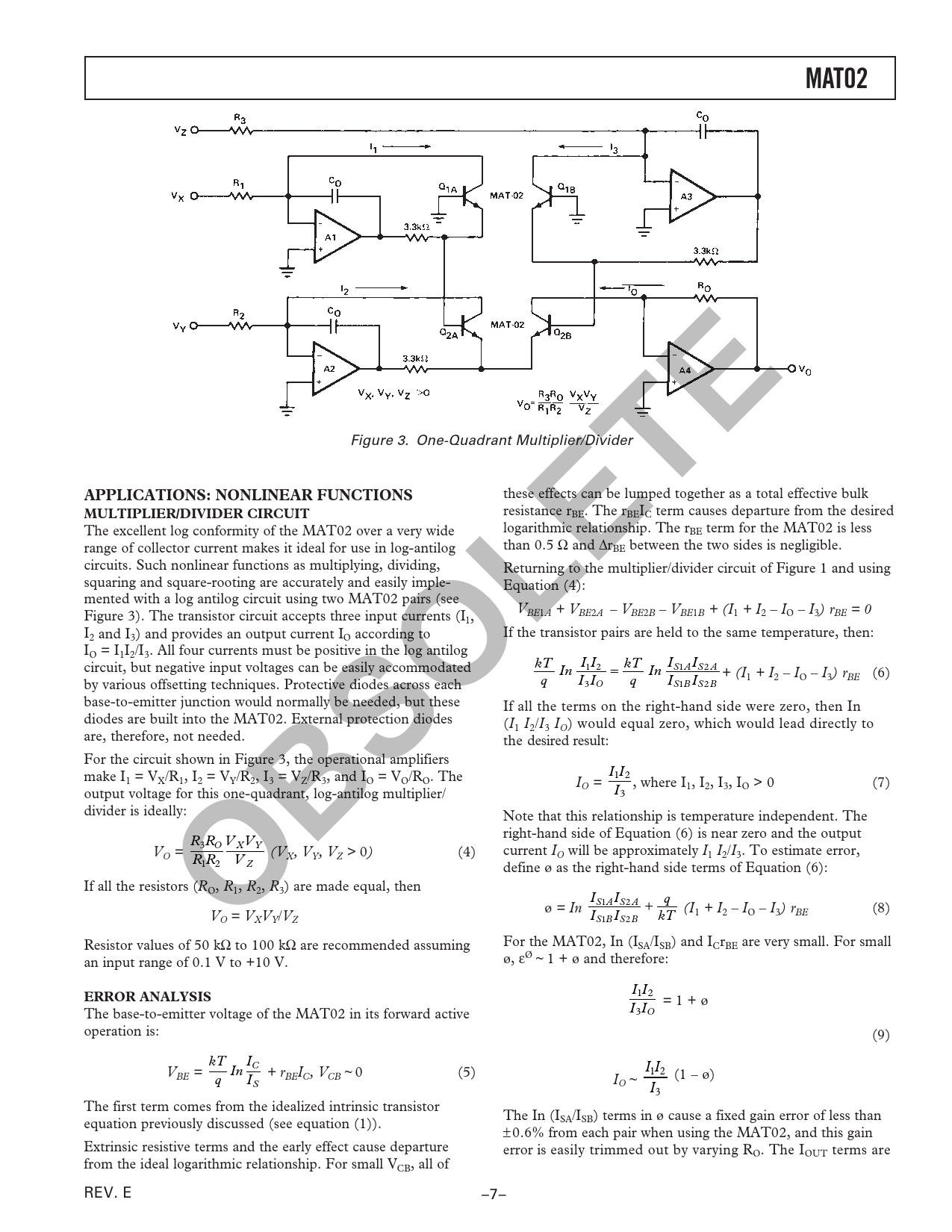 MAT02. APPLICATIONS: NONLINEAR FUNCTIONS. MULTIPLIER/DIVIDER CIRCUIT. OBSOLETE. ERROR ANALYSIS