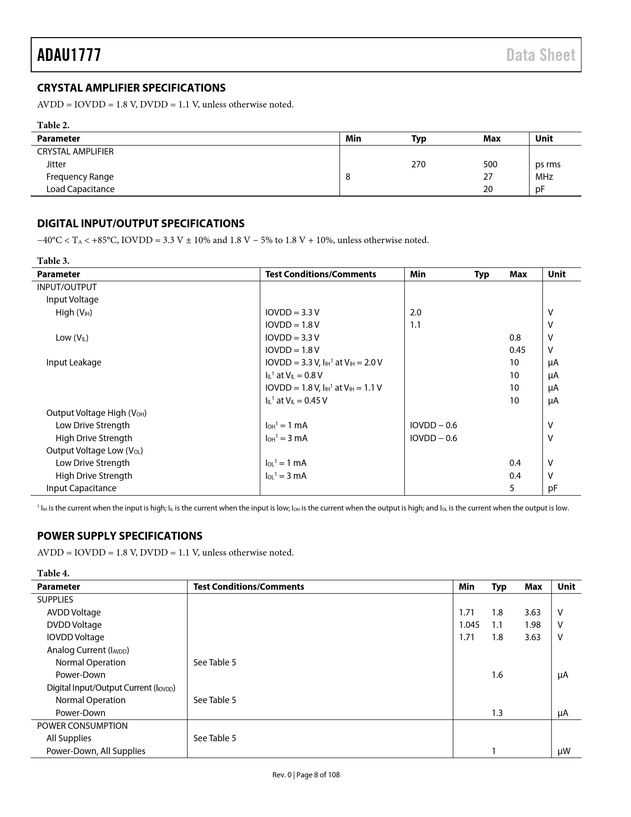 link to page 9 link to page 9 link to page 9 ADAU1777Data SheetCRYSTAL AMPLIFIER SPECIFICATIONS AVDD = IOVDD = 1.8 V, DVDD = 1.1 V, unless otherwise noted. Table 2. ParameterMinTypMaxUnit CRYSTAL AMPLIFIER Jitter 270 500 ps rms Frequency Range 8 27 MHz Load Capacitance 20 pF DIGITAL INPUT/OUTPUT SPECIFICATIONS −40°C < TA < +85°C, IOVDD = 3.3 V ± 10% and 1.8 V − 5% to 1.8 V + 10%, unless otherwise noted. Table 3. ParameterTest Conditions/CommentsMinTypMaxUnit INPUT/OUTPUT Input Voltage High (VIH) IOVDD = 3.3 V 2.0 V IOVDD = 1.8 V 1.1 V Low (VIL) IOVDD = 3.3 V 0.8 V IOVDD = 1.8 V 0.45 V Input Leakage IOVDD = 3.3 V, I 1 IH at VIH = 2.0 V 10 µA I 1 IL at VIL = 0.8 V 10 µA IOVDD = 1.8 V, I 1 IH at VIH = 1.1 V 10 µA I 1 IL at VIL = 0.45 V 10 µA Output Voltage High (VOH) Low Drive Strength I 1 OH = 1 mA IOVDD − 0.6 V High Drive Strength I 1 OH = 3 mA IOVDD − 0.6 V Output Voltage Low (VOL) Low Drive Strength I 1 OL = 1 mA 0.4 V High Drive Strength I 1 OL = 3 mA 0.4 V Input Capacitance 5 pF 1 IIH is the current when the input is high; IIL is the current when the input is low; IOH is the current when the output is high; and IOL is the current when the output is low. POWER SUPPLY SPECIFICATIONS AVDD = IOVDD = 1.8 V, DVDD = 1.1 V, unless otherwise noted. Table 4. ParameterTest Conditions/CommentsMinTypMaxUnit SUPPLIES AVDD Voltage 1.71 1.8 3.63 V DVDD Voltage 1.045 1.1 1.98 V IOVDD Voltage 1.71 1.8 3.63 V Analog Current (IAVDD) Normal Operation See Table 5 Power-Down 1.6 µA Digital Input/Output Current (IIOVDD) Normal Operation See Table 5 Power-Down 1.3 µA POWER CONSUMPTION All Supplies See Table 5 Power-Down, All Supplies 1 µW Rev. 0 | Page 8 of 108 Document Outline FEATURES APPLICATIONS GENERAL DESCRIPTION FUNCTIONAL BLOCK DIAGRAM REVISION HISTORY SPECIFICATIONS ANALOG PERFORMANCE SPECIFICATIONS CRYSTAL AMPLIFIER SPECIFICATIONS DIGITAL INPUT/OUTPUT SPECIFICATIONS POWER SUPPLY SPECIFICATIONS TYPICAL POWER MANAGEMENT SETTINGS DIGITAL FILTERS SPECIFICATIONS DIGITAL TIMING SPECIFICATIONS Digital Timing Diagrams ABSOLUTE MAXIMUM RATINGS THERMAL RESISTANCE ESD CAUTION PIN CONFIGURATION AND FUNCTION DESCRIPTIONS TYPICAL PERFORMANCE CHARACTERISTICS THEORY OF OPERATION SYSTEM CLOCKING AND POWER-UP CLOCK INITIALIZATION PLL Bypass Setup PLL Enabled Setup Control Port Access During Initialization PLL Input Clock Divider Integer Mode Fractional Mode CLOCK OUTPUT POWER SEQUENCING Power-Down Considerations SIGNAL ROUTING INPUT SIGNAL PATHS ANALOG INPUTS Signal Polarity Input Impedance Analog Microphone Inputs Analog Line Inputs Precharging Input Capacitors Microphone Bias DIGITAL MICROPHONE INPUT ANALOG-TO-DIGITAL CONVERTERS (ADCs) ADC Full-Scale Level Digital ADC Volume Control High-Pass Filter OUTPUT SIGNAL PATHS ANALOG OUTPUTS Headphone Output Headphone Output Power-Up Sequencing Ground Centered Headphone Configuration Pop and Click Suppression Line Outputs DIGITAL-TO-ANALOG CONVERTERS (DACs) DAC Full-Scale Level Digital DAC Volume Control PDM OUTPUT ASYNCHRONOUS SAMPLE RATE CONVERTERS SIGNAL LEVELS SIGNAL PROCESSING INSTRUCTIONS DATA MEMORY PARAMETERS CONTROL PORT BURST MODE COMMUNICATION I2C PORT Addressing I2C Read and Write Operations SPI PORT Read/Write Subaddress Data Bytes SELF BOOT EEPROM Size Cyclic Redundancy Check (CRC) Delay Boot Time MULTIPURPOSE PINS PUSH-BUTTON VOLUME CONTROLS LIMITER COMPRESSION ENABLE PARAMETER BANK SWITCHING MUTE DSP BYPASS MODE SERIAL DATA INPUT/OUTPUT PORTS TRISTATING UNUSED CHANNELS APPLICATIONS INFORMATION POWER SUPPLY BYPASS CAPACITORS LAYOUT GROUNDING PCB STACKUP LOW LATENCY REGISTER SETTINGS REGISTER SUMMARY REGISTER DETAILS CLOCK CONTROL REGISTER PLL DENOMINATOR MSB REGISTER PLL DENOMINATOR LSB REGISTER PLL NUMERATOR MSB REGISTER PLL NUMERATOR LSB REGISTER PLL INTEGER SETTING REGISTER PLL LOCK FLAG REGISTER CLKOUT SETTING SELECTION REGISTER REGULATOR CONTROL REGISTER CORE CONTROL REGISTER SLEEP ON PROGRAM ADDRESS COUNT REGISTER FILTER ENGINE AND LIMITER CONTROL REGISTER DB VALUE REGISTER 0 READ DB VALUE REGISTER 1 READ DB VALUE REGISTER 2 READ CORE CHANNEL 0/CORE CHANNEL 1 INPUT SELECT REGISTER CORE CHANNEL 2/CORE CHANNEL 3 INPUT SELECT REGISTER DAC INPUT SELECT REGISTER PDM MODULATOR INPUT SELECT REGISTER SERIAL DATA OUTPUT 0/SERIAL DATA OUTPUT 1 INPUT SELECT REGISTER SERIAL DATA OUTPUT 2/SERIAL DATA OUTPUT 3 INPUT SELECT REGISTER SERIAL DATA OUTPUT 4/SERIAL DATA OUTPUT 5 INPUT SELECT REGISTER SERIAL DATA OUTPUT 6/SERIAL DATA OUTPUT 7 INPUT SELECT REGISTER ADC_SDATA0/ADC_SDATA1 CHANNEL SELECT REGISTER OUTPUT ASRC0/OUTPUT ASRC1 SOURCE REGISTER OUTPUT ASRC2/OUTPUT ASRC3 SOURCE REGISTER INPUT ASRC CHANNEL SELECT REGISTER ADC0/ADC1 CONTROL 0 REGISTER ADC2/ADC3 CONTROL 0 REGISTER ADC0/ADC1 CONTROL 1 REGISTER ADC2/ADC3 CONTROL 1 REGISTER ADC0 VOLUME CONTROL REGISTER ADC1 VOLUME CONTROL REGISTER ADC2 VOLUME CONTROL REGISTER ADC3 VOLUME CONTROL REGISTER PGA CONTROL 0 REGISTER PGA CONTROL 1 REGISTER PGA CONTROL 2 REGISTER PGA CONTROL 3 REGISTER PGA SLEW CONTROL REGISTER PGA 10 DB GAIN BOOST REGISTER INPUT AND OUTPUT CAPACITOR CHARGING REGISTER DSP BYPASS PATH REGISTER DSP BYPASS GAIN FOR PGA0 REGISTER DSP BYPASS GAIN FOR PGA1 REGISTER MICBIAS0_1 CONTROL REGISTER DAC CONTROL REGISTER DAC0 VOLUME CONTROL REGISTER DAC1 VOLUME CONTROL REGISTER HEADPHONE OUTPUT MUTES REGISTER SERIAL PORT CONTROL 0 REGISTER SERIAL PORT CONTROL 1 REGISTER TDM OUTPUT CHANNEL DISABLE REGISTER PDM ENABLE REGISTER PDM PATTERN SETTING REGISTER MP0 FUNCTION SETTING REGISTER MP1 FUNCTION SETTING REGISTER MP2 FUNCTION SETTING REGISTER MP3 FUNCTION SETTING REGISTER MP4 FUNCTION SETTING REGISTER MP5 FUNCTION SETTING REGISTER MP6 FUNCTION SETTING REGISTER PUSH-BUTTON VOLUME SETTINGS REGISTER PUSH-BUTTON VOLUME CONTROL ASSIGNMENT REGISTER DEBOUNCE MODES REGISTER HEADPHONE LINE OUTPUT SELECT REGISTER DECIMATOR POWER CONTROL REGISTER ASRC INTERPOLATOR AND DAC MODULATOR POWER CONTROL REGISTER ANALOG BIAS CONTROL 0 REGISTER ANALOG BIAS CONTROL 1 REGISTER DIGITAL PIN PULL-UP CONTROL 0 REGISTER DI