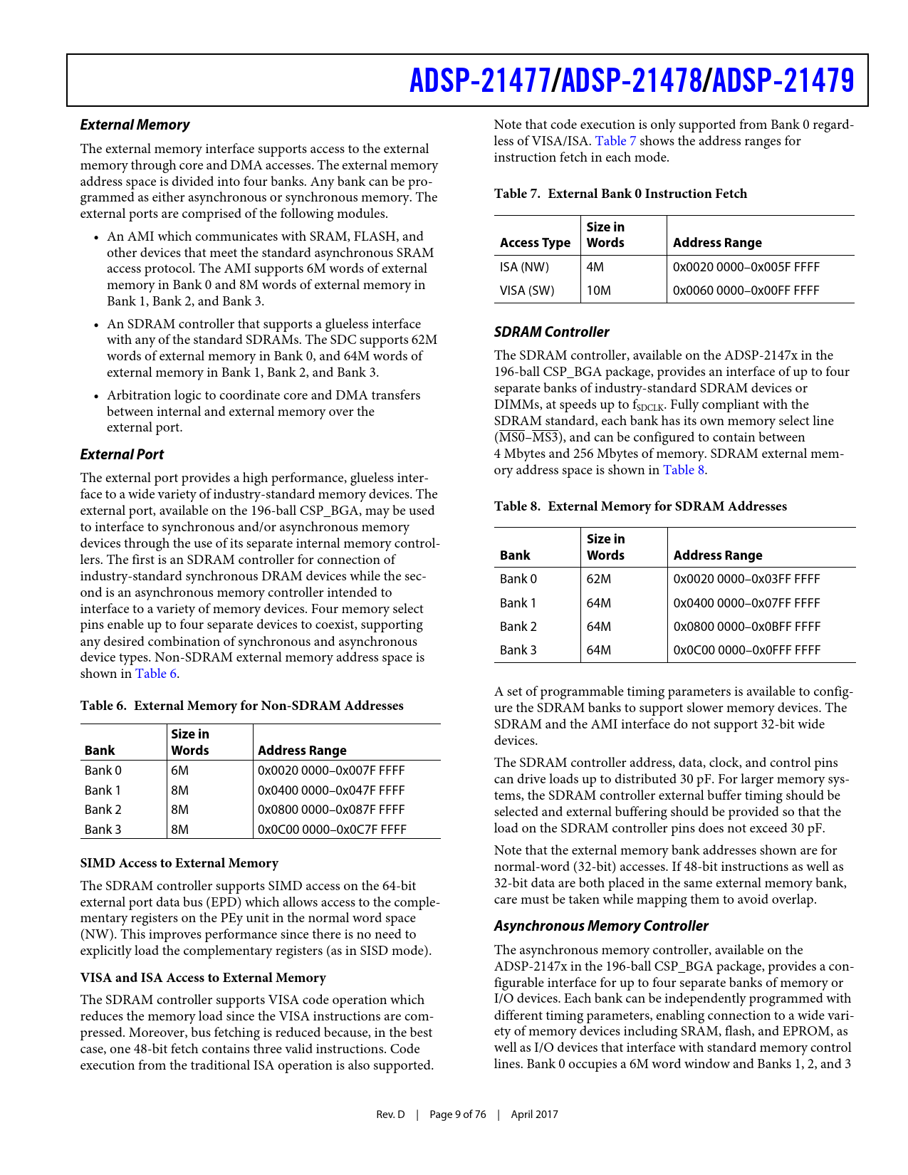 Note that code execution is only supported from Bank 0 regard- less of VISA/ISA. Table 7 shows the address ranges for The external memory interface supports access to the external instruction fetch in each mode. memory through core and DMA accesses. The external memory address space is divided into four banks. Any bank can be pro- grammed as either asynchronous or synchronous memory. The