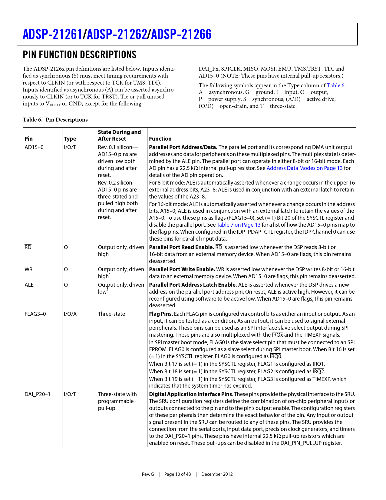 link to page 10 link to page 13 link to page 13 ADSP-21261/ADSP-21262/ADSP-21266PIN FUNCTION DESCRIPTIONS The ADSP-2126x pin definitions are listed below. Inputs identi- DAI_Px, SPICLK, MISO, MOSI, EMU, TMS,TRST, TDI and fied as synchronous (S) must meet timing requirements with AD15–0 (NOTE: These pins have internal pull-up resistors.) respect to CLKIN (or with respect to TCK for TMS, TDI). The following symbols appear in the Type column of Table 6: Inputs identified as asynchronous (A) can be asserted asynchro- A = asynchronous, G = ground, I = input, O = output, nously to CLKIN (or to TCK for TRST). Tie or pull unused P = power supply, S = synchronous, (A/D) = active drive, inputs to VDDEXT or GND, except for the following: (O/D) = open-drain, and T = three-state. Table 6. Pin DescriptionsState During andPin TypeAfter ResetFunction AD15–0 I/O/T Rev. 0.1 silicon— Parallel Port Address/Data. The parallel port and its corresponding DMA unit output AD15–0 pins are addresses and data for peripherals on these multiplexed pins. The multiplex state is deter- driven low both mined by the ALE pin. The parallel port can operate in either 8-bit or 16-bit mode. Each during and after AD pin has a 22.5 k internal pull-up resistor. See Address Data Modes on Page 13 for reset. details of the AD pin operation. Rev. 0.2 silicon— For 8-bit mode: ALE is automatically asserted whenever a change occurs in the upper 16 AD15–0 pins are external address bits, A23–8; ALE is used in conjunction with an external latch to retain three-stated and the values of the A23–8. pulled high both For 16-bit mode: ALE is automatically asserted whenever a change occurs in the address during and after bits, A15–0; ALE is used in conjunction with an external latch to retain the values of the reset. A15–0. To use these pins as flags (FLAG15–0), set (= 1) Bit 20 of the SYSCTL register and disable the parallel port. See Table 7 on Page 13 for a list of how the AD15–0 pins map to the flag pins. When configured in the IDP_PDAP_CTL register, the IDP Channel 0 can use these pins for parallel input data. RD O Output only, driven Parallel Port Read Enable. RD is asserted low whenever the DSP reads 8-bit or high1 16-bit data from an external memory device. When AD15–0 are flags, this pin remains deasserted. WR O Output only, driven Parallel Port Write Enable. WR is asserted low whenever the DSP writes 8-bit or 16-bit high1 data to an external memory device. When AD15–0 are flags, this pin remains deasserted. ALE O Output only, driven Parallel Port Address Latch Enable. ALE is asserted whenever the DSP drives a new low1 address on the parallel port address pin. On reset, ALE is active high. However, it can be reconfigured using software to be active low. When AD15–0 are flags, this pin remains deasserted. FLAG3–0 I/O/A Three-state Flag Pins. Each FLAG pin is configured via control bits as either an input or output. As an input, it can be tested as a condition. As an output, it can be used to signal external peripherals. These pins can be used as an SPI interface slave select output during SPI mastering. These pins are also multiplexed with the IRQx and the TIMEXP signals. In SPI master boot mode, FLAG0 is the slave select pin that must be connected to an SPI EPROM. FLAG0 is configured as a slave select during SPI master boot. When Bit 16 is set (= 1) in the SYSCTL register, FLAG0 is configured as IRQ0. When Bit 17 is set (= 1) in the SYSCTL register, FLAG1 is configured as IRQ1. When Bit 18 is set (= 1) in the SYSCTL register, FLAG2 is configured as IRQ2. When Bit 19 is set (= 1) in the SYSCTL register, FLAG3 is configured as TIMEXP, which indicates that the system timer has expired. DAI_P20–1 I/O/T Three-state with Digital Application Interface Pins . These pins provide the physical interface to the SRU. programmable The SRU configuration registers define the combination of on-chip peripheral inputs or pull-up outputs connected to the pin and to the pin’s output enable. The configuration registers of these peripherals then determine the exact behavior of the pin. Any input or output signal present in the SRU can be routed to any of these pins. The SRU provides the connection from the serial ports, input data port, precision clock generators, and timers to the DAI_P20–1 pins. These pins have internal 22.5 k pull-up resistors which are enabled on reset. These pull-ups can be disabled in the DAI_PIN_PULLUP register. Rev. G | Page 10 of 48 | December 2012 Document Outline Summary Table of Contents Revision History General Description Family Core Architecture SIMD Computational Engine Independent, Parallel Computation Units Data Register File Single-Cycle Fetch of Instruction and Four Operands Instruction Cache Data Address Generators with Zero-Overhead Hardware Circular Buffer Support Flexible Instruction Set Memory and I/O Interface Features Dual-Ported On-Chip Memory DMA Controller Digital Application Interface (DAI) Serial Ports Serial Peripheral (Compatible) Interface Parallel Port Timers ROM-Based Security Program Booting Phase-Locked Loop Power Supplies Target Board JTAG Emulator Connector Development Tools Integrated Development Environments (IDEs) EZ-KIT Lite Evaluation Board EZ-KIT Lite Evaluation Kits Software Add-Ins for CrossCore Embedded Studio Board Support Packages for Evaluation Hardware Middleware Packages Algorithmic Modules Designing an Emulator-Compatible DSP Board (Target) Additional Information Related Signal Chains Pin Function Descriptions Address Data Pins as Flags Boot Modes Core Instruction Rate to CLKIN Ratio Modes Address Data Modes Product Specifications Operating Conditions Electrical Characteristics Package Information ESD Caution Maximum Power Dissipation Absolute Maximum Ratings Timing Specifications Core Clock Requirements Voltage Controlled Oscillator Power-Up Sequencing Clock Input Clock Signals Reset Interrupts Core Timer Timer PWM_OUT Cycle Timing Timer WDTH_CAP Tim