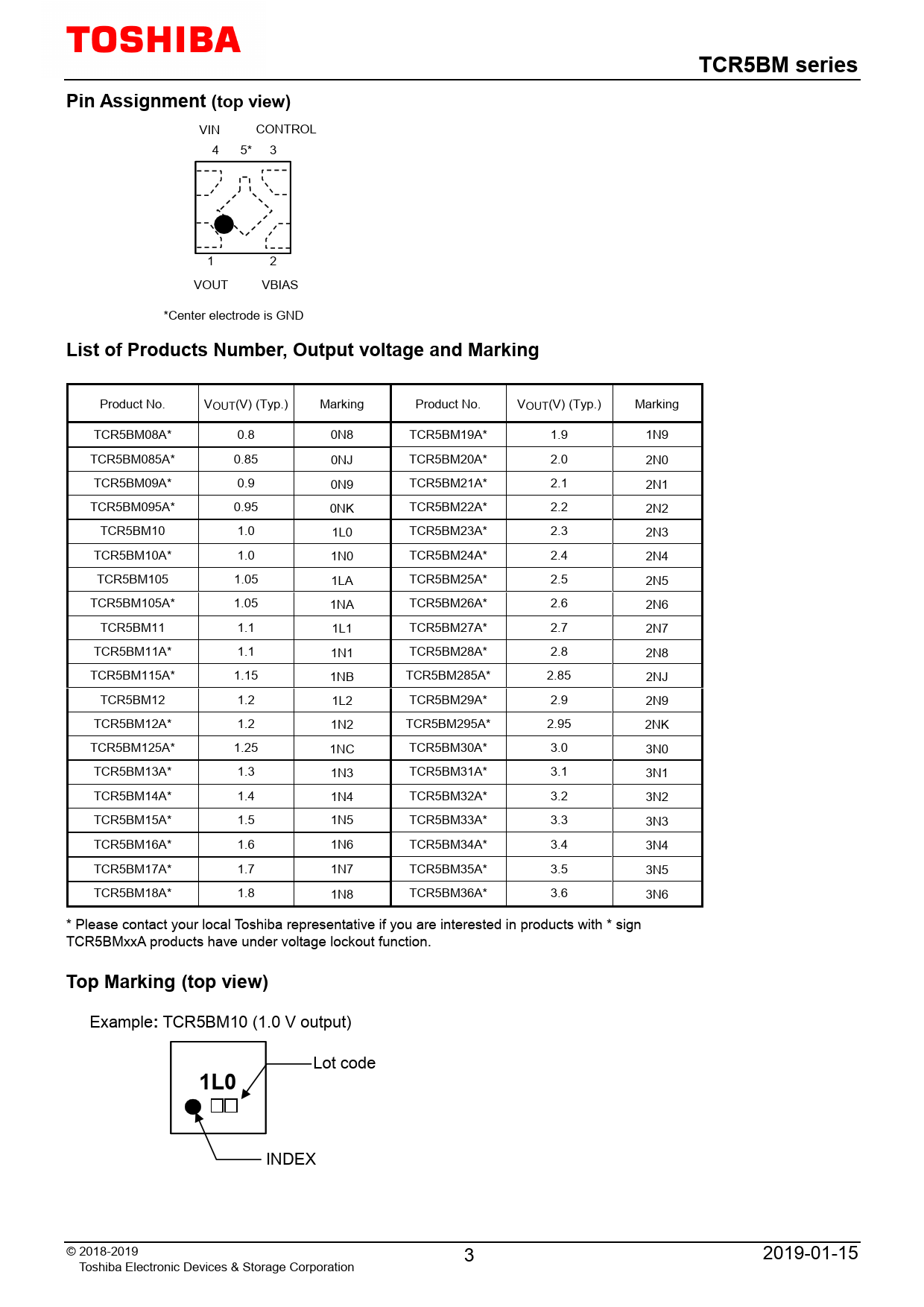 TCR5BM series. Pin Assignment (top view). List of Products Number, Output voltage and Marking. Top Marking. (top view). 1L0