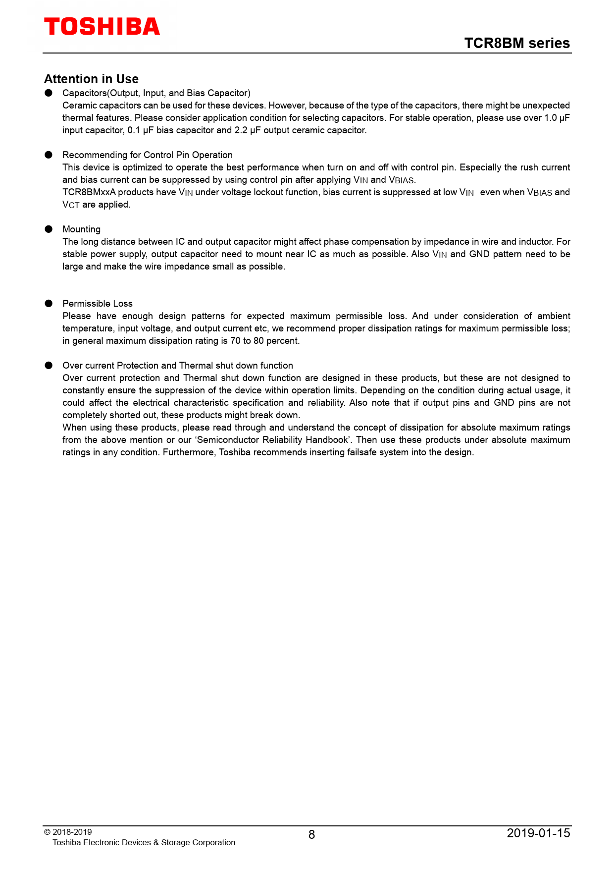 ● Capacitors(Output, Input, and Bias Capacitor) Ceramic capacitors can be used for these devices. However, because of the type of the capacitors, there might be unexpected thermal features. Please consider application condition for selecting capacitors. For stable operation, please use over 1.0 μF input capacitor, 0.1 μF bias capacitor and 2.2 μF output ceramic capacitor. ● Recommending for Control Pin Operation This device is optimized to operate the best performance when turn on and off with control pin. Especial y the rush current and bias current can be suppressed by using control pin after applying VIN and VBIAS. TCR8BMxxA products have VIN under voltage lockout function, bias current is suppressed at low VIN even when VBIAS and VCT are applied. ● Mounting The long distance between IC and output capacitor might affect phase compensation by impedance in wire and inductor. For stable power supply, output capacitor need to mount near IC as much as possible. Also VIN and GND pattern need to be large and make the wire impedance small as possible. ● Permissible Loss Please have enough design patterns for expected maximum permissible loss. And under consideration of ambient temperature, input voltage, and output current etc, we recommend proper dissipation ratings for maximum permissible loss; in general maximum dissipation rating is 70 to 80 percent. ● Over current Protection and Thermal shut down function Over current protection and Thermal shut down function are designed in these products, but these are not designed to constantly ensure the suppression of the device within operation limits. Depending on the condition during actual usage, it could affect the electrical characteristic specification and reliability. Also note that if output pins and GND pins are not completely shorted out, these products might break down. When using these products, please read through and understand the concept of dissipation for absolute maximum ratings from the above mention or our ‘Semiconductor Reliability Handbook’. Then use these products under absolute maximum ratings in any condition. Furthermore, Toshiba recommends inserting failsafe system into the design. © 2018-2019 8 2019-01-15 Toshiba Electronic Devices & Storage Corporation