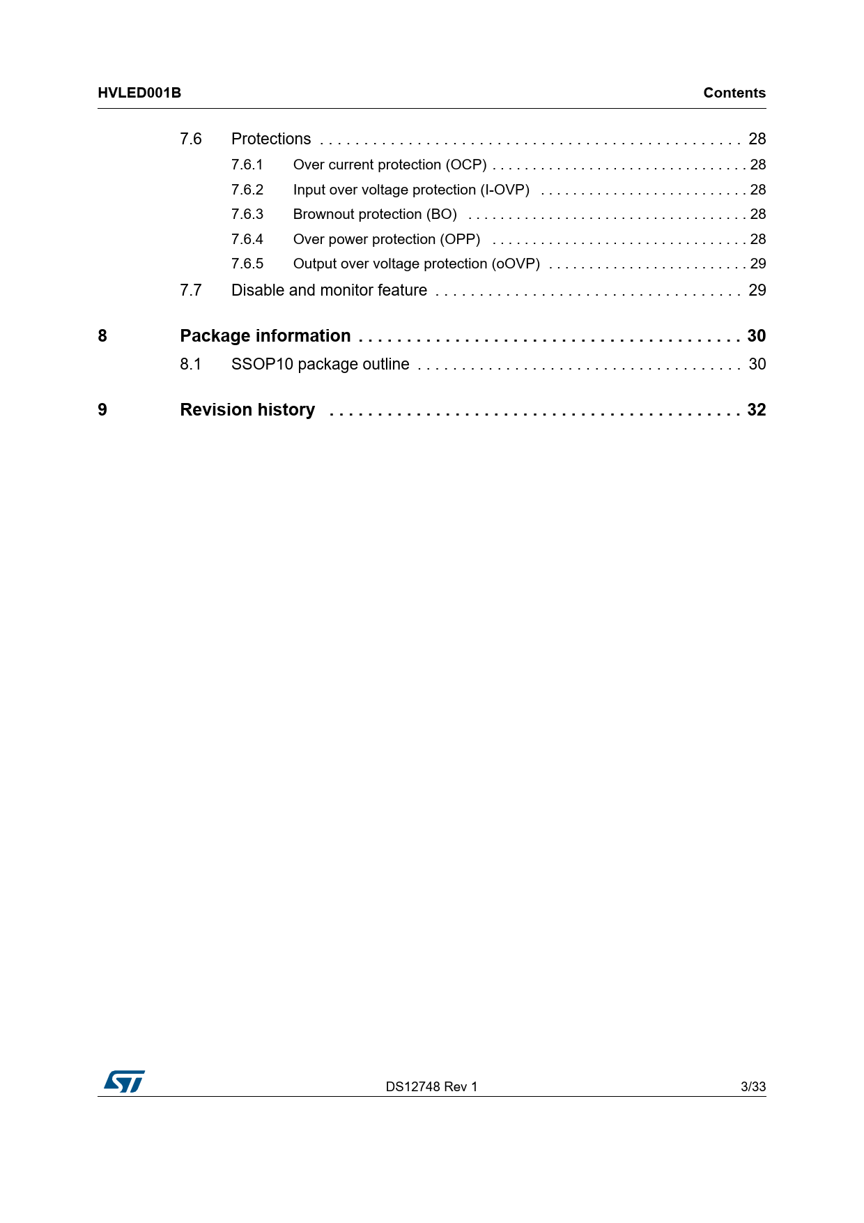 link to page 28 link to page 28 link to page 28 link to page 28 link to page 28 link to page 29 link to page 29 link to page 30 link to page 30 link to page 32 HVLED001BContents 7.6 Protections . 28 7.6.1 Over current protection (OCP) . 28 7.6.2 Input over voltage protection (I-OVP) . 28 7.6.3 Brownout protection (BO) . 28 7.6.4 Over power protection (OPP) . 28 7.6.5 Output over voltage protection (oOVP) . 29 7.7 Disable and monitor feature . 29 8Package information . 30 8.1 SSOP10 package outline . 30 9Revision history . 32 DS12748 Rev 1 3/33 33 Document Outline Table 1. Device summary 1 Block diagram Figure 1. Block diagram 2 Typical application - HPF flyback Figure 2. Primary side regulated (PSR) application Figure 3. Secondary side regulated (SSR) application 3 Pin settings Figure 4. Pin connection Table 2. Pin description (continued) 4 Electrical data 4.1 Absolute maximum ratings Table 3. Absolute maximum ratings 4.2 Thermal data Table 4. Thermal data 4.3 Recommended operating conditions Table 5. Recommended operating conditions 5 Electrical characteristics Table 6. Electrical characteristics (continued) 6 Typical electrical characteristic 6.1 Parameter graphs Figure 5. ICC vs. Fsw @ VCC = 15V Figure 6. VCC,on and VCC,su vs. Tj Figure 7. Icharge and Icharge,su vs. Tj Figure 8. IFB,src and IFB,snk vs. Tj Figure 9. Vbm, Vbm2 and VOPTO,dis vs. Tj Figure 10. Tbm and Tbm2 vs. Tj Figure 11. VZCD,arm and VZCD,trig vs. Tj Figure 12. VCS,lim vs. Tj Figure 13. VREF,PSR vs. Tj Figure 14. IFB vs. VZCD sample Figure 15. TBLANK,min vs. Tj Figure 16. TBLANK,var vs. Tj 7 Application information 7.1 Operating modes Figure 17. High power factor flyback - Primary side regulated constant output voltage Figure 18. High power factor flyback – Secondary side regulated application 7.1.1 Start-up mode Figure 19. Initial start-up phase 7.1.2 Ramp-up mode 7.1.3 Active mode 7.1.4 Low consumption mode 7.1.5 Stop mode 7.2 Control loop Figure 20. Control loop blocks 7.2.1 Current sense input 7.2.2 Feedback input 7.2.3 Zero current detection Figure 21. TBLANK,var time vs. TOFF voltage Figure 22. TBLANK,var time vs. TOFF voltage 7.2.4 Primary side regulation feature Figure 23. PSR E/A small signal model 7.2.5 Burst mode operation 7.3 Gate driver 7.4 IC supply management 7.4.1 VCC supply management 7.4.2 High voltage startup Table 7. HVSU operating modes 7.5 Auto restart timer (ART) 7.6 Protections 7.6.1 Over current protection (OCP) 7.6.2 Input over voltage protection (I-OVP) 7.6.3 Brownout protection (BO) 7.6.4 Over power protection (OPP) 7.6.5 Output over voltage protection (oOVP) 7.7 Disable and monitor feature 8 Package information 8.1 SSOP10 package outline Figure 24. SSOP10 package mechanical data Table 8. SSOP10 package mechanical data 9 Revision history Table 9. Document history