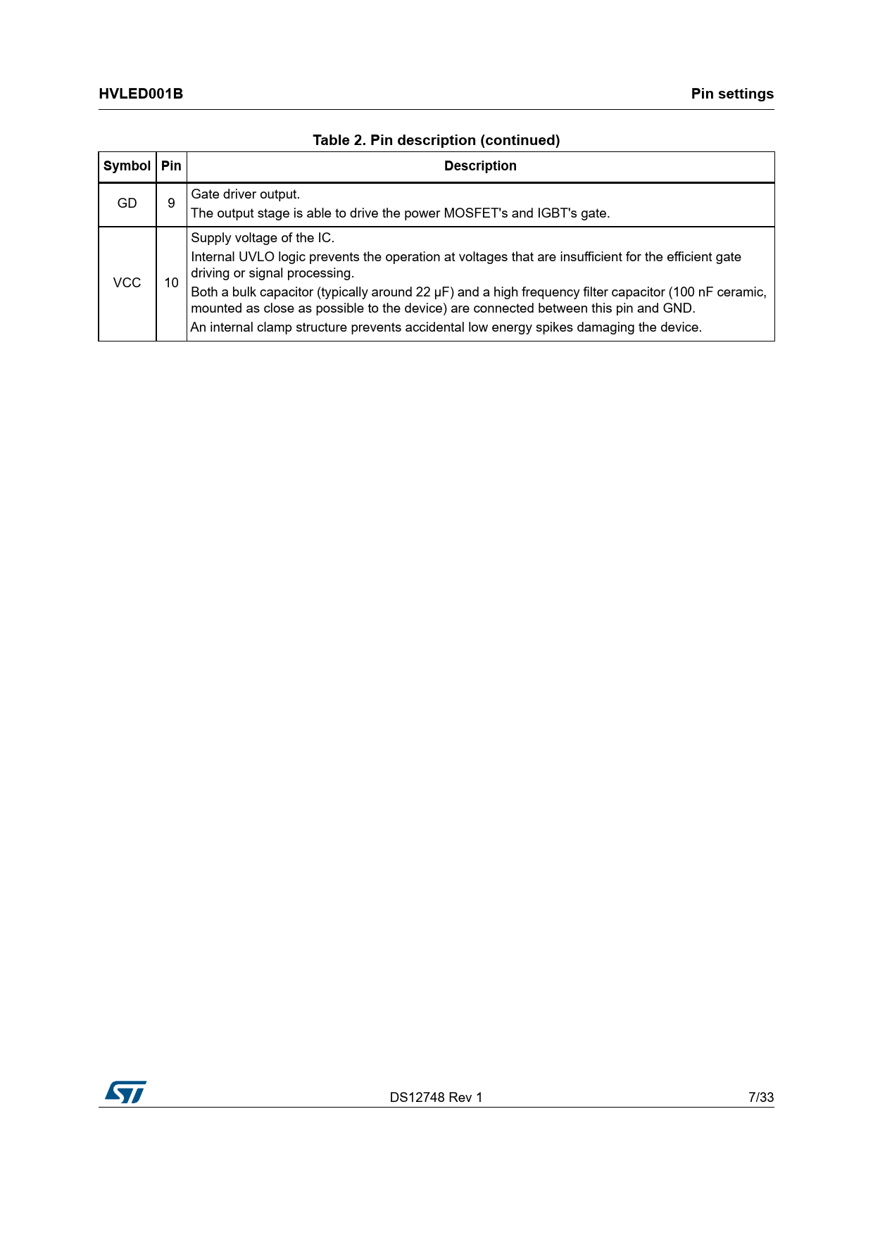 Pages / Page33 / 7 — HVLED001B. Pin settings. Table 2. Pin description (continued). Symbol …