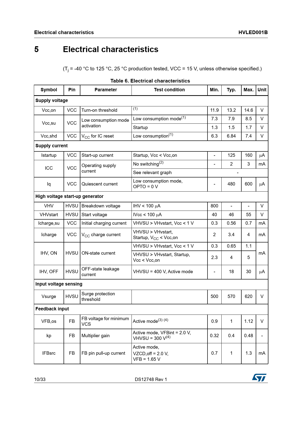 | Pages / Page | 33 / 10 — Electrical characteristics. HVLED001B. Table 6. Electrical … |