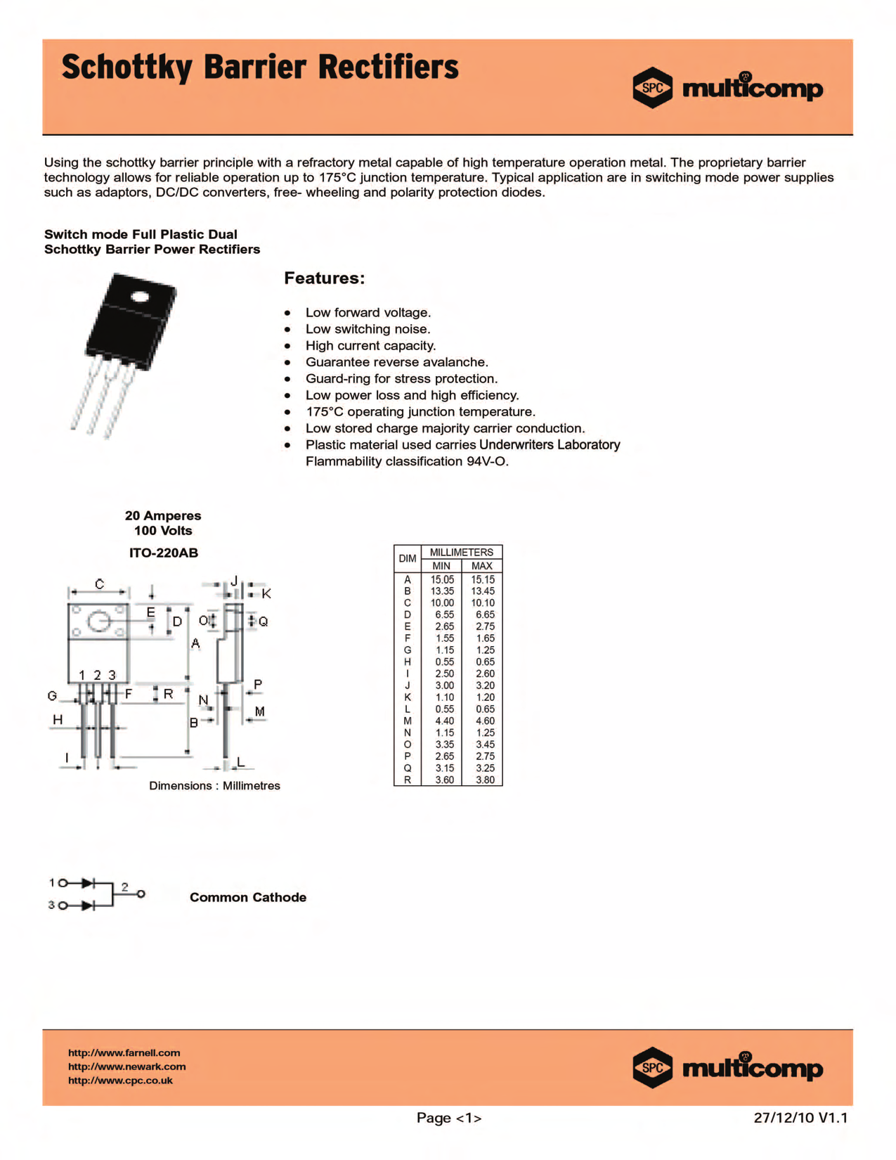 Datasheet MBRF20100CT (Multicomp)