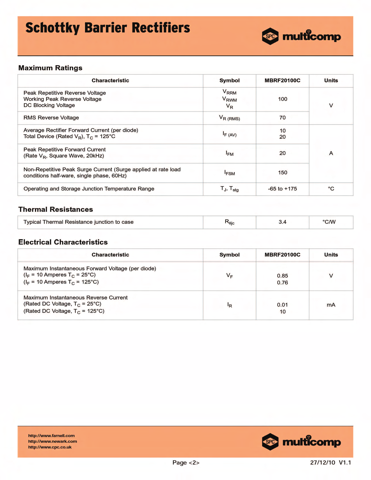 Datasheet MBRF20100CT (Multicomp) - 2