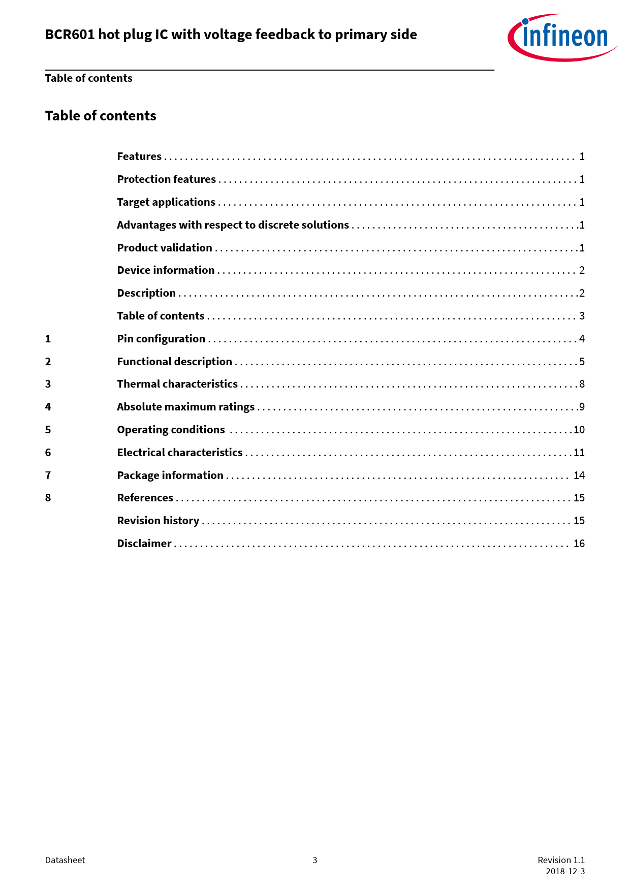 BCR601 hot plug IC with voltage feedback to primary side Table of contents Table of contents Features