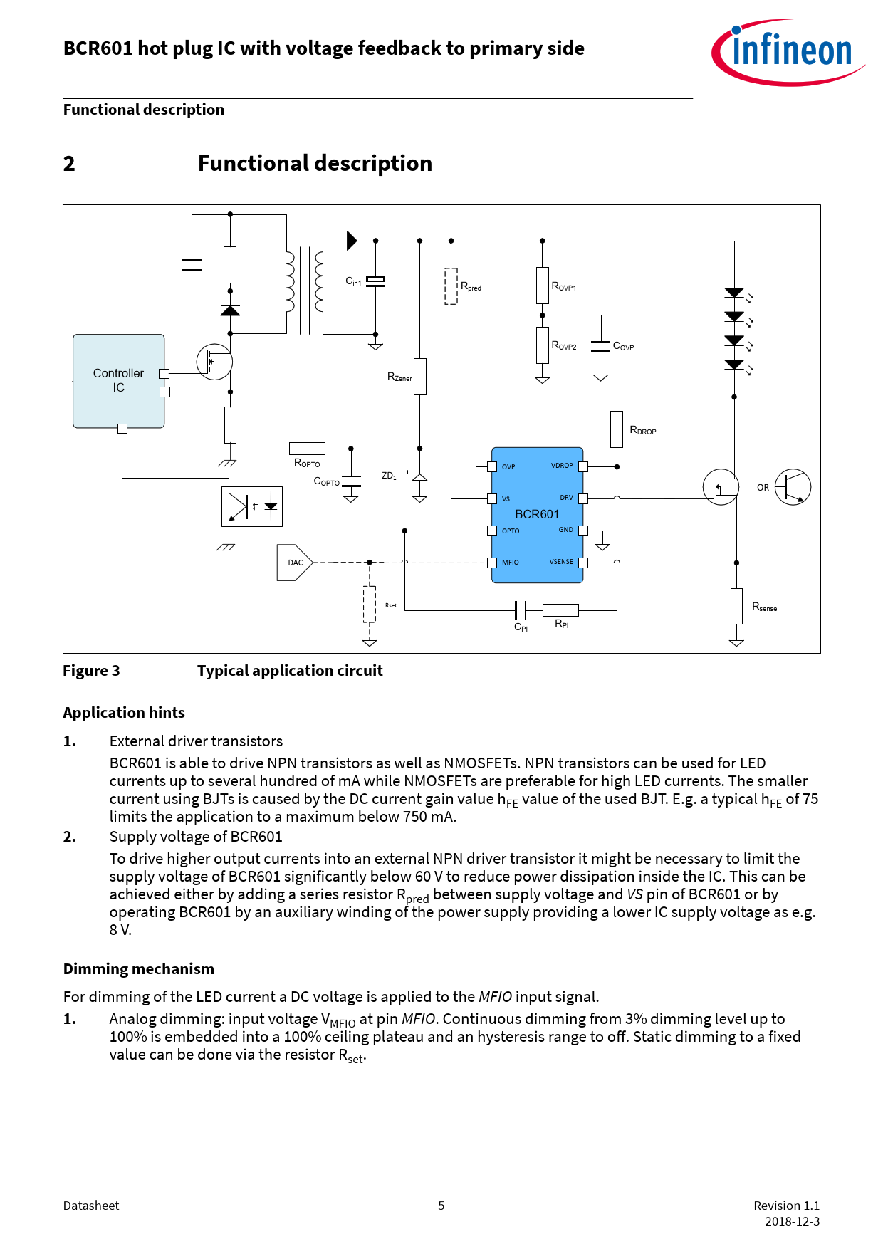 Supply voltage of BCR601 To drive higher output currents into an external NPN driver transistor it might be necessary to limit the supply voltage of BCR601 significantly below 60 V to reduce power dissipation inside the IC. This can be achieved either by adding a series resistor Rpred between supply voltage and VS pin of BCR601 or by operating BCR601 by an auxiliary winding of the power supply providing a lower IC supply voltage as e.g. 8 V.