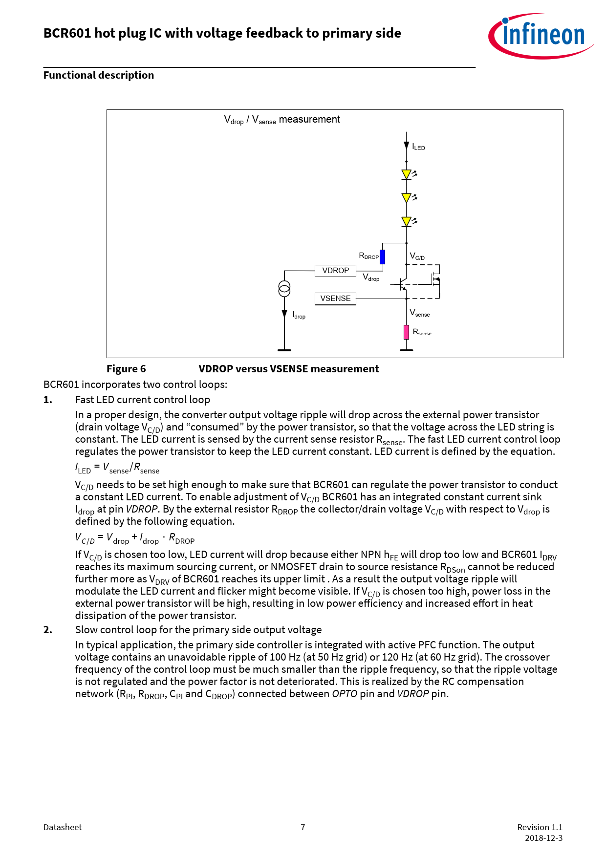 Fast LED current control loop In a proper design, the converter output voltage ripple will drop across the external power transistor (drain voltage VC/D) and “consumed” by the power transistor, so that the voltage across the LED string is constant. The LED current is sensed by the current sense resistor Rsense. The fast LED current control loop regulates the power transistor to keep the LED current constant. LED current is defined by the equation. ILED = Vsense/Rsense VC/D needs to be set high enough to make sure that BCR601 can regulate the power transistor to conduct a constant LED current. To enable adjustment of VC/D BCR601 has an integrated constant current sink Idrop at pin VDROP. By the external resistor RDROP the collector/drain voltage VC/D with respect to Vdrop is defined by the following equation. VC/D = Vdrop + Idrop ⋅ RDROP If VC/D is chosen too low, LED current will drop because either NPN hFE will drop too low and BCR601 IDRV reaches its maximum sourcing current, or NMOSFET drain to source resistance RDSon cannot be reduced further more as VDRV of BCR601 reaches its upper limit . As a result the output voltage ripple will modulate the LED current and flicker might become visible. If VC/D is chosen too high, power loss in the external power transistor will be high, resulting in low power efficiency and increased effort in heat dissipation of the power transistor.