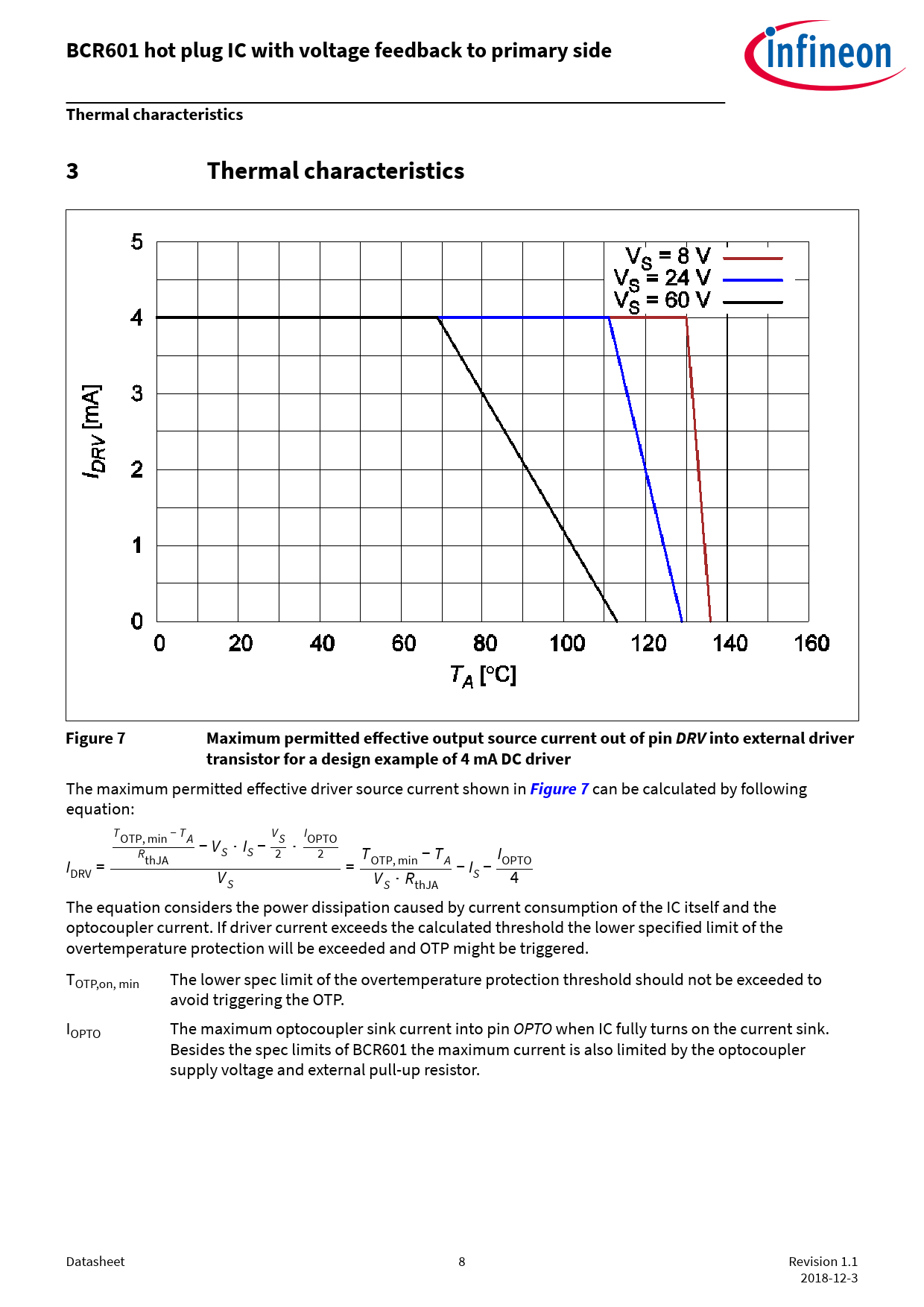 can be calculated by following equation: TOTP,min − TA V I − V S OPTO R S ⋅ IS − 2 ⋅ 2 T I I thJA OTP, min − T A OPTO DRV = V = − IS − S VS ⋅ RthJA 4 The equation considers the power dissipation caused by current consumption of the IC itself and the optocoupler current. If driver current exceeds the calculated threshold the lower specified limit of the overtemperature protection will be exceeded and OTP might be triggered. TOTP,on, min The lower spec limit of the overtemperature protection threshold should not be exceeded to avoid triggering the OTP. IOPTO The maximum optocoupler sink current into pin OPTO when IC fully turns on the current sink. Besides the spec limits of BCR601 the maximum current is also limited by the optocoupler supply voltage and external pull-up resistor. Datasheet 8 Revision 1.1 2018-12-3 Document Outline Features Protection features Target applications Advantages with respect to discrete solutions Product validation Device information Description Table of contents 1 Pin configuration 2 Functional description 3 Thermal characteristics 4 Absolute maximum ratings 5 Operating conditions 6 Electrical characteristics 7 Package information 8 References Revision history Disclaimer
