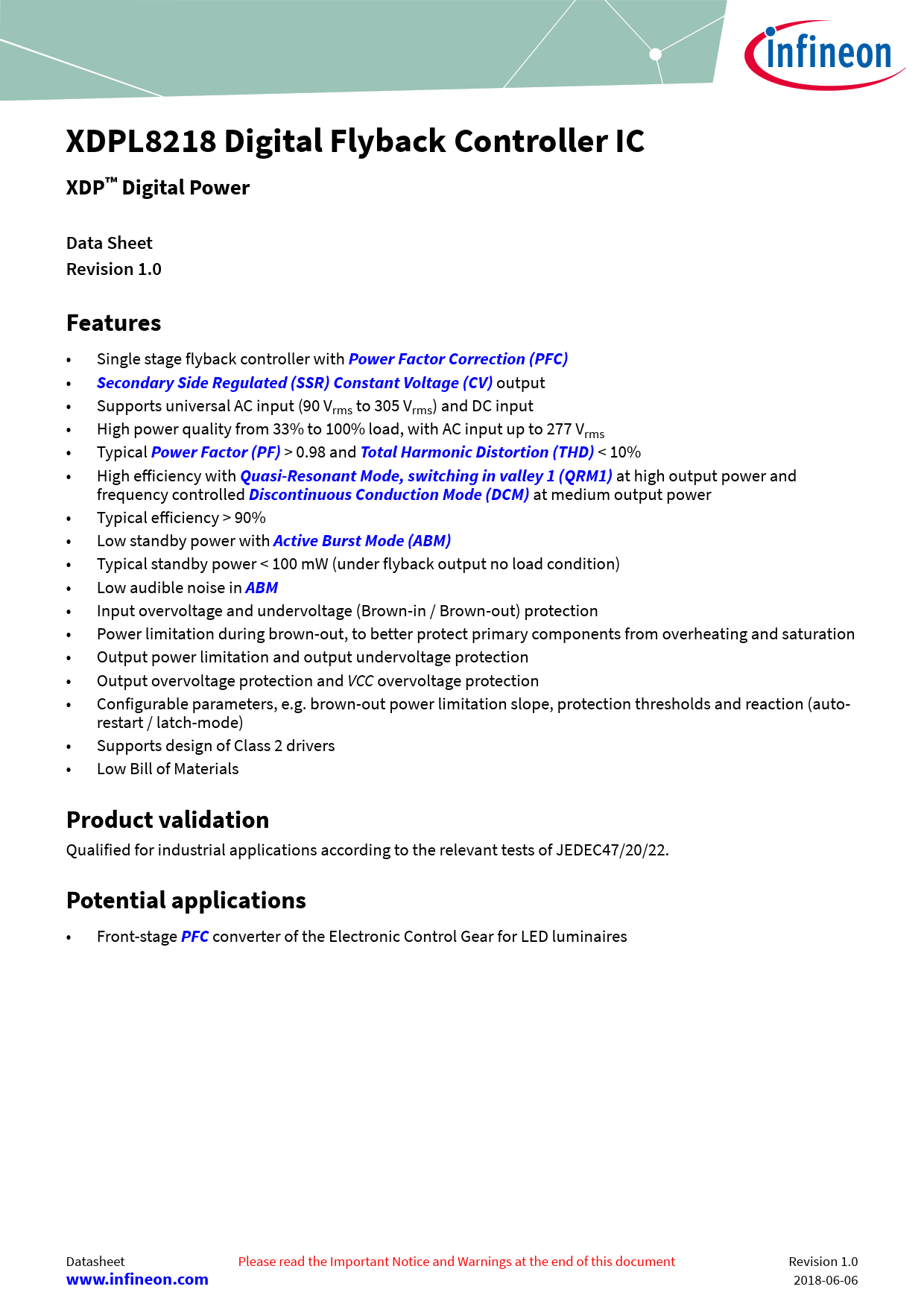 XDPL8218 Digital Flyback Controller IC XDP™ Digital Power. Data Sheet Revision 1.0. Features. Power Factor Correction (PFC)