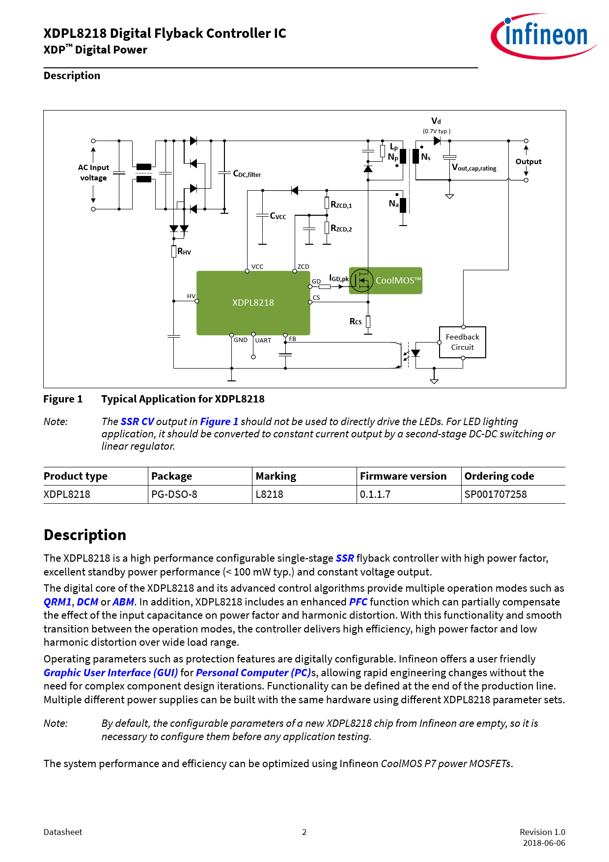 link to page 43 link to page 42 link to page 2 link to page 43 link to page 43 link to page 42 link to page 42 link to page 43 link to page 43 link to page 43 XDPL8218 Digital Flyback Controller ICXDP™ Digital PowerDescriptionVd (0.7V typ.) LpNpNsOutputAC InputVout,cap,ratingvoltageCDC,filterRZCD,1NaCVCCRZCD,2RHV VCC ZCD GD IGD,pk CoolMOS™ HV XDPL8218 CS RCS GND UART FB Feedback Circuit Figure 1Typical Application for XDPL8218 Note: The SSRCV output in Figure 1 should not be used to directly drive the LEDs. For LED lighting application, it should be converted to constant current output by a second-stage DC-DC switching or linear regulator. Product typePackageMarkingFirmware versionOrdering code XDPL8218 PG-DSO-8 L8218 0.1.1.7 SP001707258 Description The XDPL8218 is a high performance configurable single-stage SSR flyback controller with high power factor, excellent standby power performance (< 100 mW typ.) and constant voltage output. The digital core of the XDPL8218 and its advanced control algorithms provide multiple operation modes such as QRM1 , DCM or ABM . In addition, XDPL8218 includes an enhanced PFC function which can partially compensate the effect of the input capacitance on power factor and harmonic distortion. With this functionality and smooth transition between the operation modes, the controller delivers high efficiency, high power factor and low harmonic distortion over wide load range. Operating parameters such as protection features are digitally configurable. Infineon offers a user friendly Graphic User Interface (GUI) for Personal Computer (PC) s, allowing rapid engineering changes without the need for complex component design iterations. Functionality can be defined at the end of the production line. Multiple different power supplies can be built with the same hardware using different XDPL8218 parameter sets. Note: By default, the configurable parameters of a new XDPL8218 chip from Infineon are empty, so it is necessary to configure them before any application testing. The system performance and efficiency can be optimized using Infineon CoolMOS P7 power MOSFETs. Datasheet 2 Revision 1.0 2018-06-06 Document Outline Features Product validation Potential applications Description Table of contents 1 Pin configuration 2 Functional block diagram 3 Functional description 3.1 Regulated mode 3.2 Configurable gate voltage rising slope at GD pin 3.3 Startup 3.4 Line synchronization 3.5 Input voltage and output voltage estimation 3.5.1 Output voltage estimation 3.5.2 Input voltage estimation 3.6 Power factor correction 3.7 Protection features 3.7.1 Primary MOSFET overcurrent protection 3.7.2 Output undervoltage protection 3.7.3 Output overvoltage protection 3.7.4 Transformer demagnetization time shortage protection 3.7.5 Minimum input voltage startup check and input undervoltage protection 3.7.6 Maximum input voltage startup check and input overvoltage protection 3.7.7 VCC undervoltage lockout 3.7.8 VCC undervoltage protection 3.7.9 VCC overvoltage protection 3.7.10 IC overtemperature protection 3.7.11 Other protections 3.7.12 Protection reactions 3.8 Debug mode 4 List of Parameters 5 Electrical Characteristics and Parameters 5.1 Package Characteristics 5.2 Absolute Maximum Ratings 5.3 Operating Conditions 5.4 DC Electrical Characteristics 6 Package Dimensions 7 References Revision History Glossary ABM CCM CRC CV DCM ECG EMI GUI IC LED OCP1 PC PF PFC QRM1 SSR THD UART USB UVLO Disclaimer