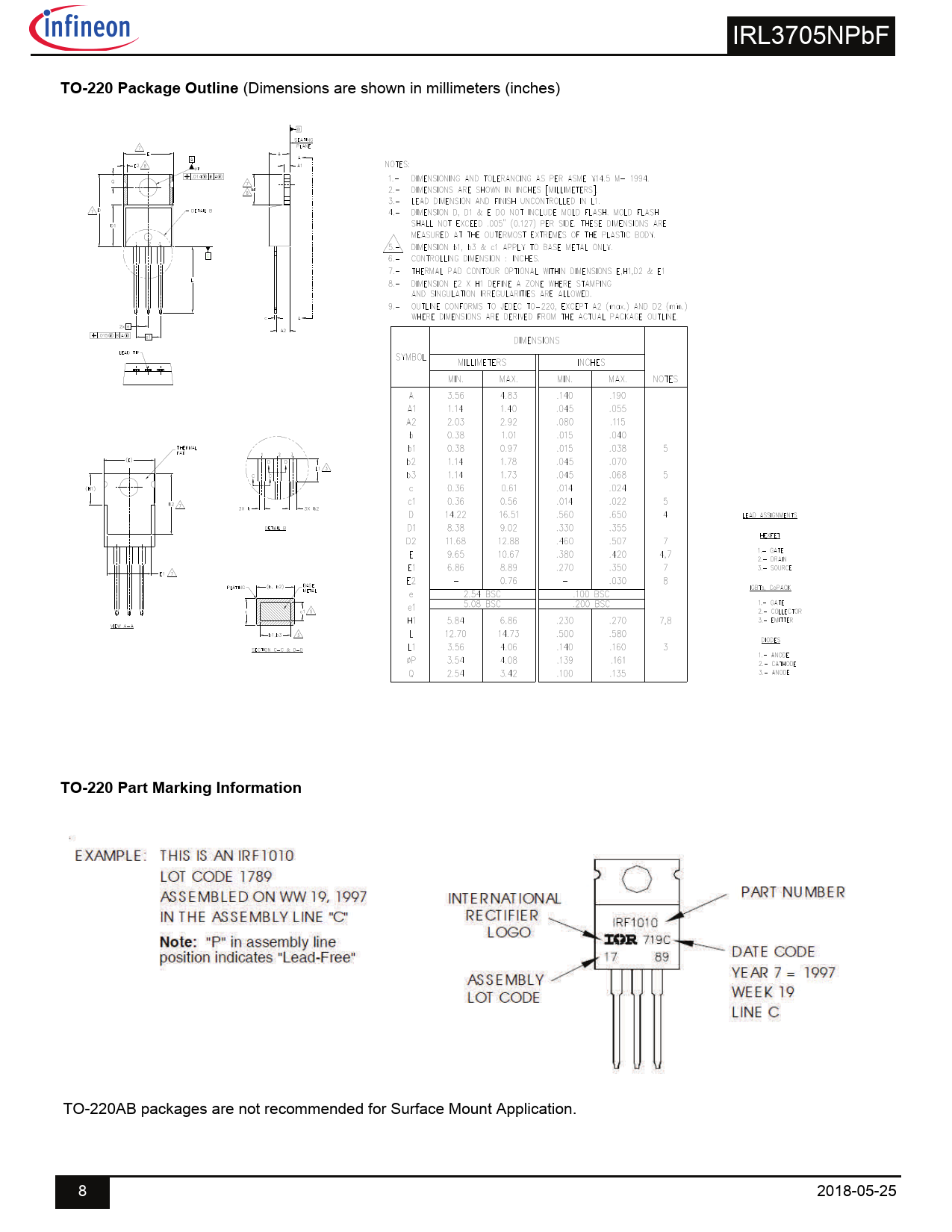 TO-220AB packages are not recommended for Surface Mount Application. 8 2018-05-25