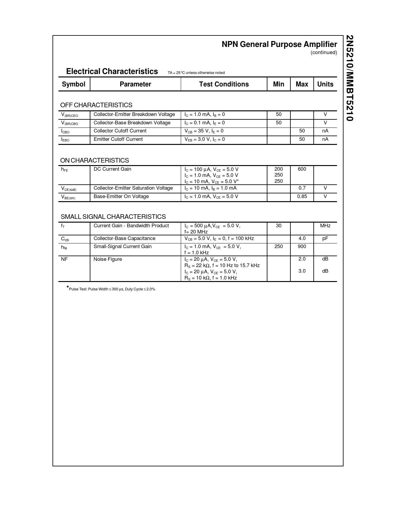 (continued) Electrical Characteristics Symbol TA = 25°C unless otherwise noted Parameter Test Conditions Min Max Units OFF CHARACTERISTICS V(BR)CEO Collector-Emitter Breakdown Voltage IC = 1.0 mA, IB = 0 50 V V(BR)CBO Collector-Base Breakdown Voltage IC = 0.1 mA, IE = 0 50 ICBO Collector Cutoff Current VCB = 35 V, IE = 0 50 nA IEBO Emitter Cutoff Current VEB = 3.0 V, IC = 0 50 nA V 2N5210/MMBT5210 NPN General Purpose Amplifier ON CHARACTERISTICS hFE DC Current Gain VCE(sat) Collector-Emitter Saturation Voltage IC = 100 µA, VCE = 5.0 V IC = 1.0 mA, VCE = 5.0 V IC = 10 mA, VCE = 5.0 V* IC = 10 mA, IB = 1.0 mA VBE(on) Base-Emitter On Voltage IC = 1.0 mA, VCE = 5.0 V 200 250 250 600 0.7 V 0.85 V SMALL SIGNAL CHARACTERISTICS fT Current Gain -Bandwidth Product Ccb Collector-Base Capacitance hfe Small-Signal Current Gain NF Noise Figure *Pulse Test: Pulse Width ≤ 300 µs, Duty Cycle ≤ 2.0% IC = 500 µA,VCE = 5.0 V, f= 20 MHz VCB = 5.0 V, IE = 0, f = 100 kHz 30 IC = 1.0 mA, VCE = 5.0 V, f = 1.0 kHz IC = 20 µA, VCE = 5.0 V, RS = 22 kΩ, f = 10 Hz to 15.7 kHz IC = 20 µA, VCE = 5.0 V, RS = 10 kΩ, f = 1.0 kHz 250 MHz 4.0 pF 900 2.0 dB 3.0 dB 3
